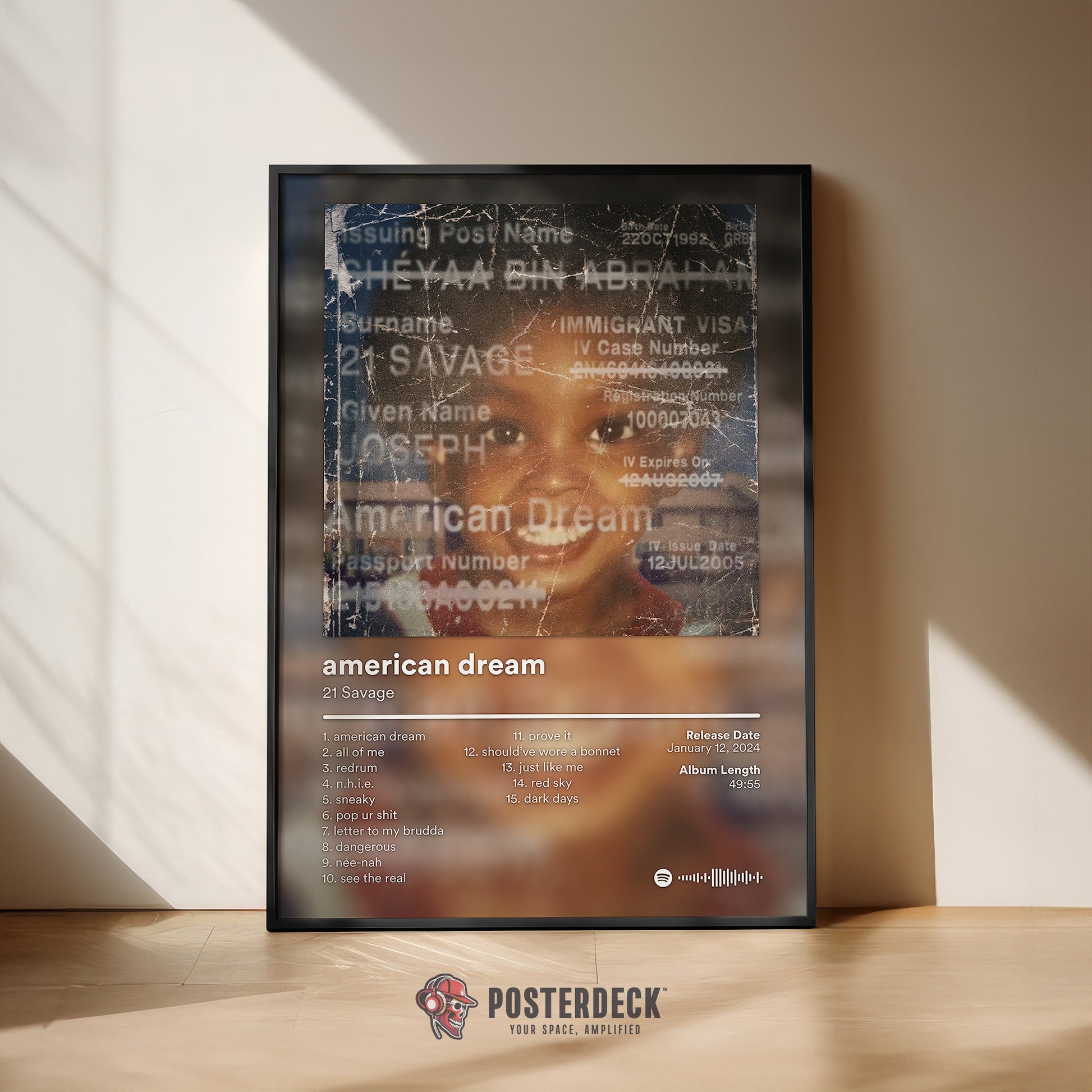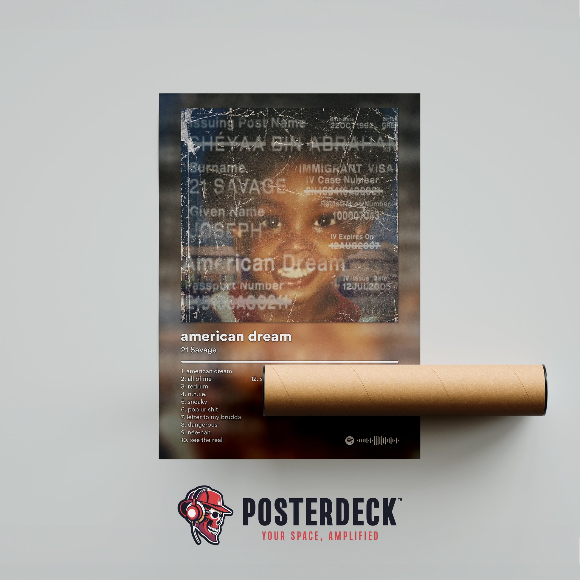 Chase the faded glory with this haunting "american dream" tracklist poster. 21 Savage’s face emerges through a cracked immigrant visa overlay—passport stamps, case numbers, and expiration dates blurring the line between arrival and survival.