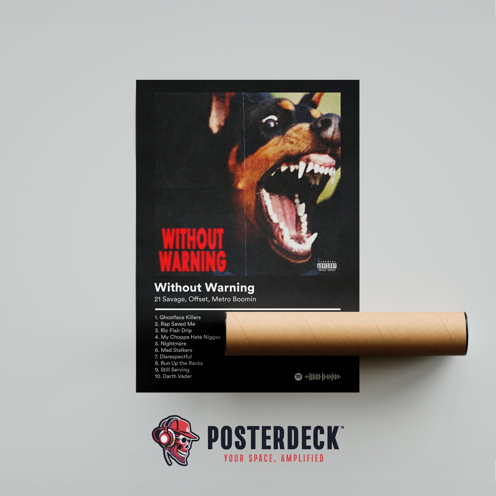 Unleash the beast with this ferocious "Without Warning" tracklist poster. A snarling Rottweiler baring bloody fangs dominates the frame—pure aggression mirroring the surprise 2017 drop from 21 Savage, Offset, and Metro Boomin.