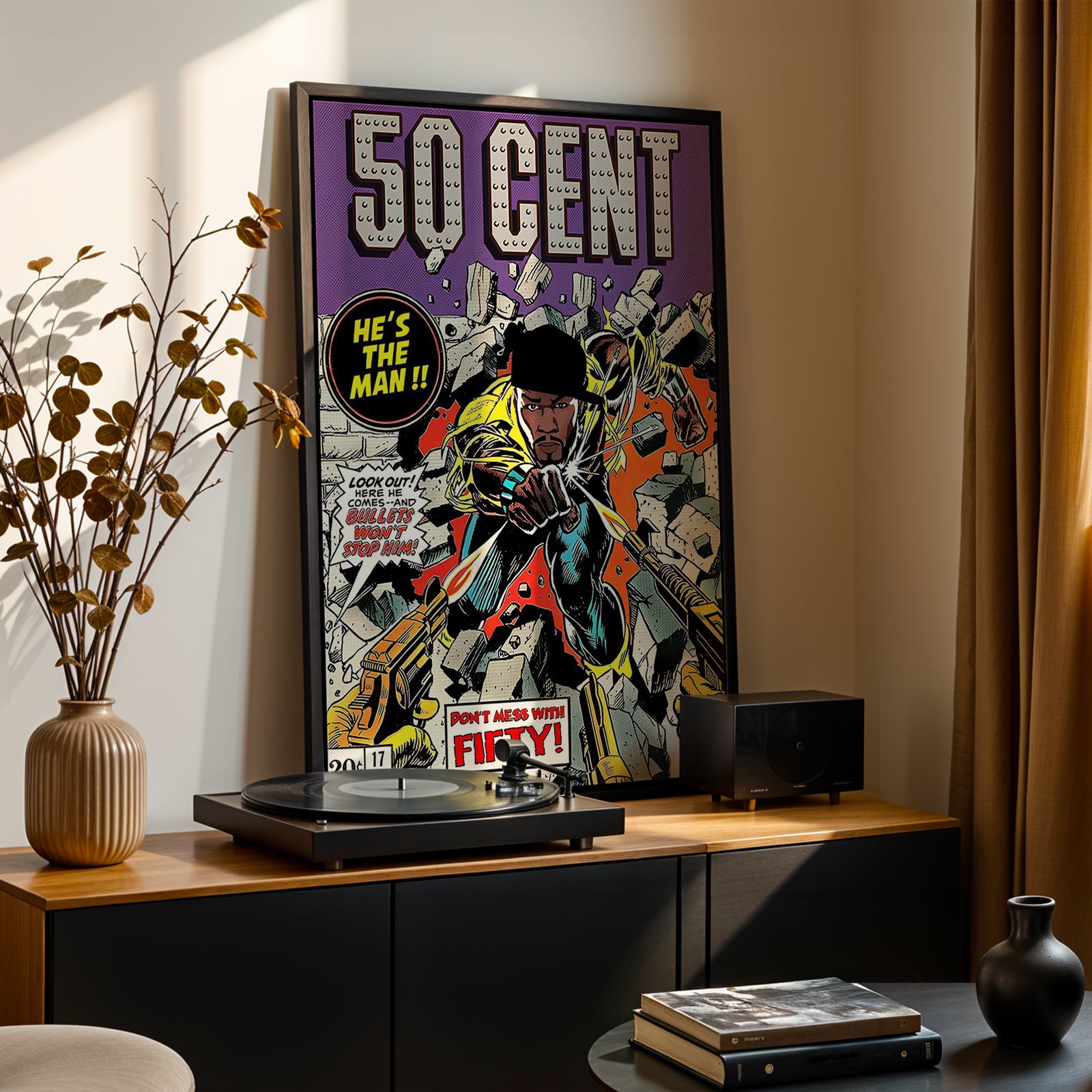 Explode onto your wall with this insane comic-book tribute to 50 Cent. Drawn like an unstoppable Marvel anti-hero, Fifty bursts through a brick wall in full bulletproof glory, surrounded by flying debris and classic speech bubbles: “HE’S THE MAN!!”, “BULLETS WON’T STOP HIM!”, and “DON’T MESS WITH FIFTY!”