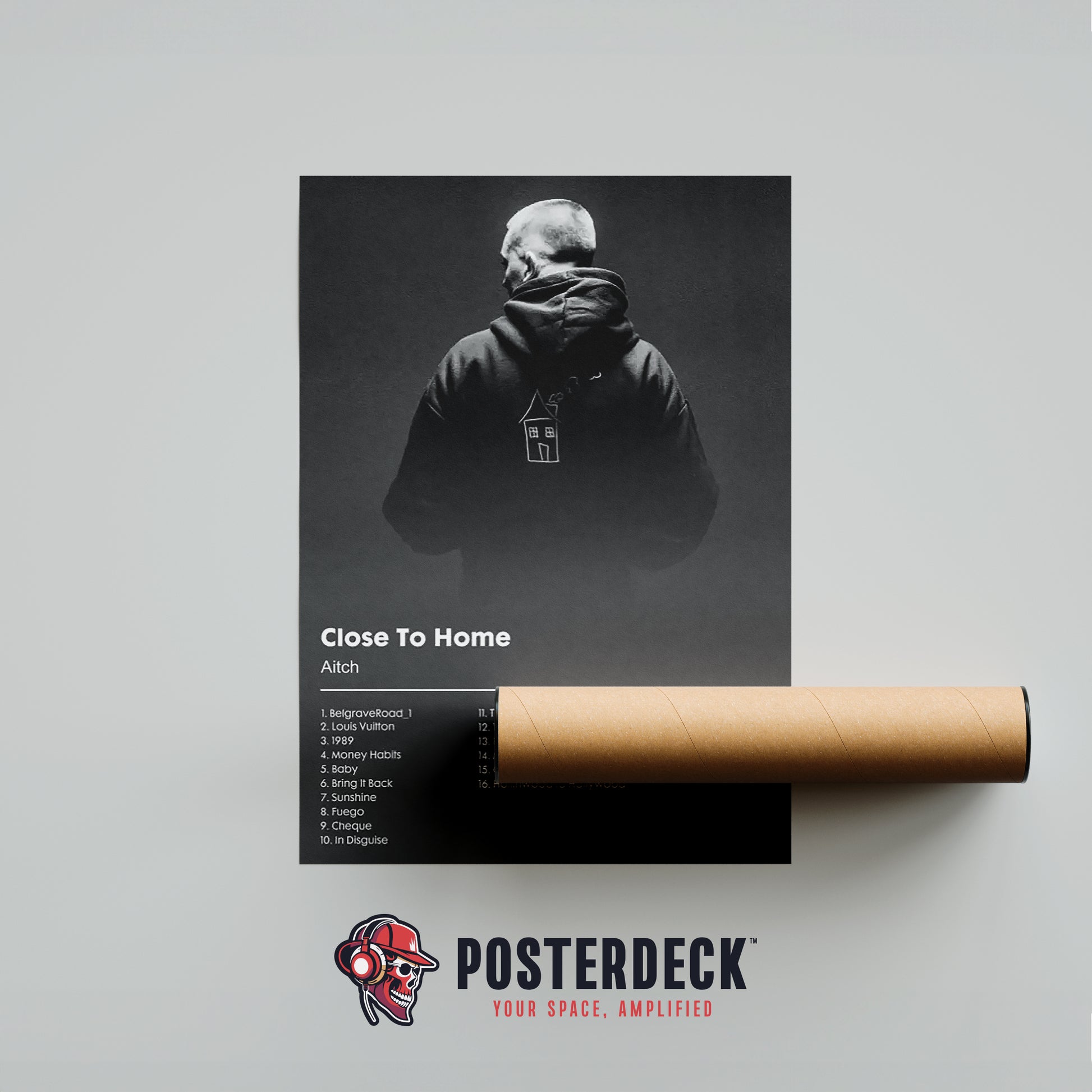 Keep it real with this moody "Close To Home" tracklist poster. Aitch stands anonymous, face hidden in a black hoodie, a simple house drawing on the back symbolizing roots, struggle, and everything he’s built from the ground up.