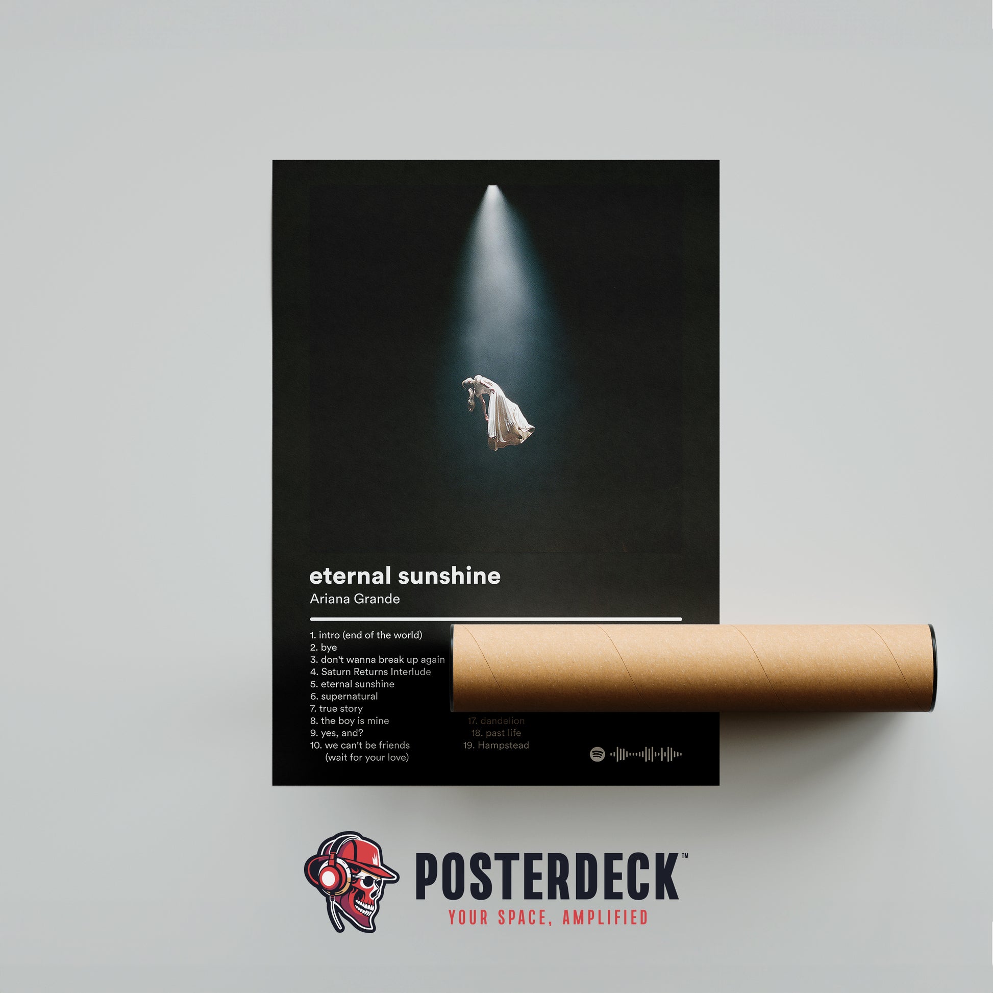 This poster captures Ariana Grande suspended in a dramatic spotlight, echoing the cinematic and emotional themes of Eternal Sunshine. Designed with a deep black backdrop and soft light, it makes a striking minimalist statement on any wall. A premium poster for collectors, fans, and modern interiors.