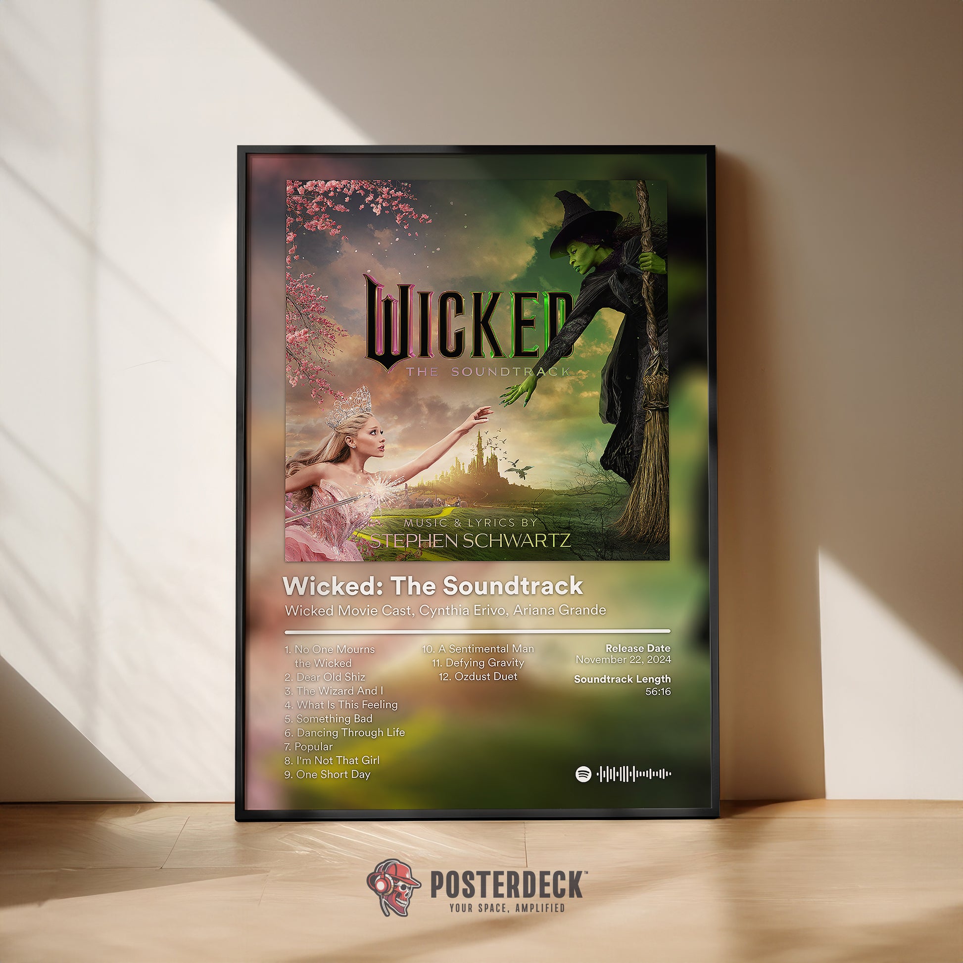 A beautifully composed Wicked soundtrack poster featuring iconic imagery from the movie — Cynthia Erivo as Elphaba and Ariana Grande as Glinda. With lush cinematic color and magical scenery, this poster makes a bold centerpiece for any musical-themed room or collection.
