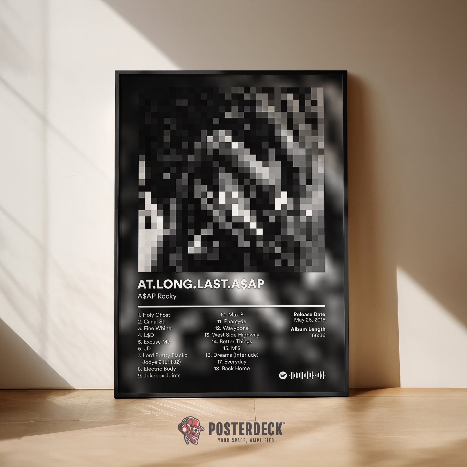 his poster celebrates A$AP Rocky’s psychedelic, introspective sophomore album AT.LONG.LAST.A$AP, released in 2015. Known for blending experimental production with trill-influenced lyricism, the project marked a creative shift for Rocky after the loss of A$AP Yams. The grayscale artwork in this framed poster captures the album’s moody energy and blurred emotional themes. A perfect display piece for fans of Rocky’s evolution and modern New York rap.