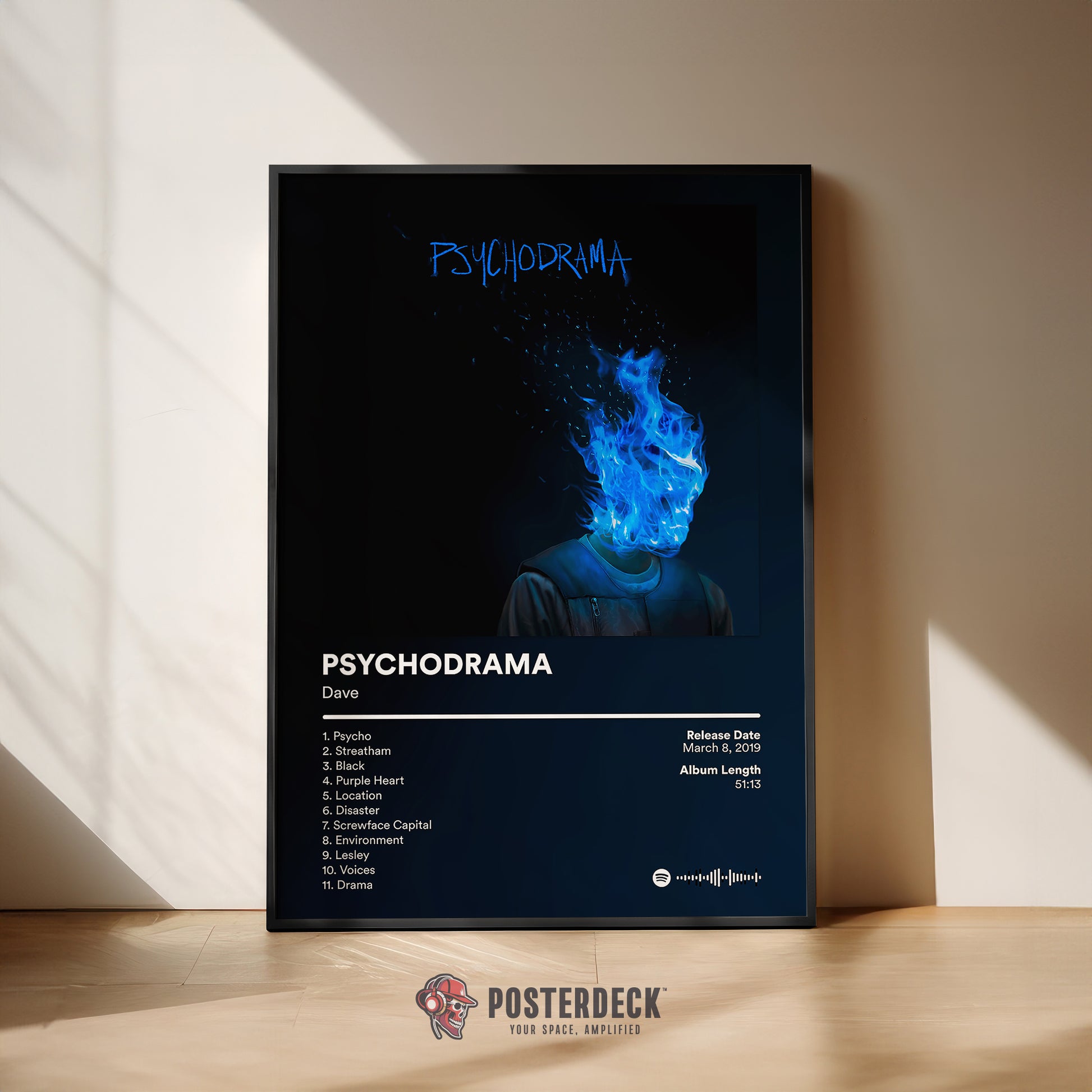 This poster highlights Psychodrama, an album centered on mental health, vulnerability, and self-examination. The blue flame visual mirrors the emotional intensity and introspection throughout the project. Ideal for listeners drawn to honest, thought-provoking storytelling.