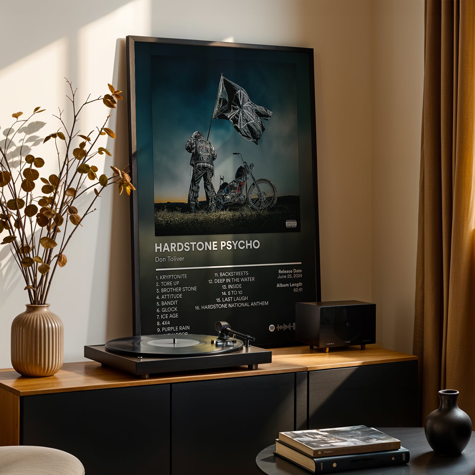 Dark, cinematic, and powerful, the Hardstone Psycho design reflects Don Toliver’s most aggressive and experimental era. With gritty visuals and commanding presence, this piece is perfect for spaces that thrive on intensity and edge.