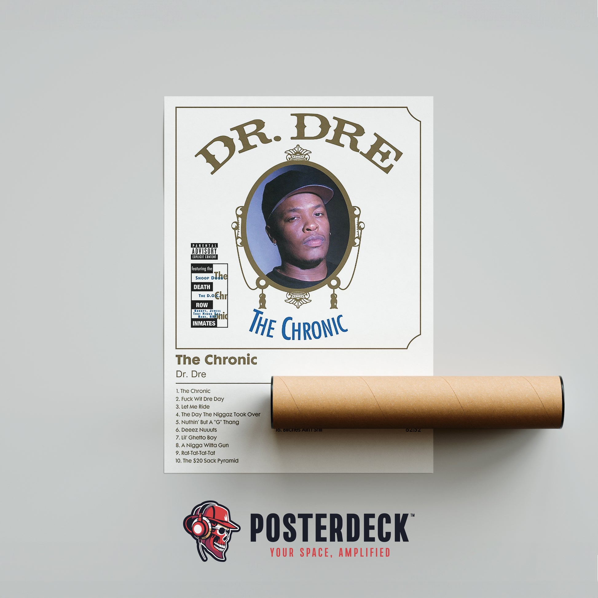 The blueprint of West Coast rap, now as an iconic wall poster. Dre’s legendary mugshot-style portrait framed in gold, crowned with the Death Row seal—this is 1992 G-funk royalty.
