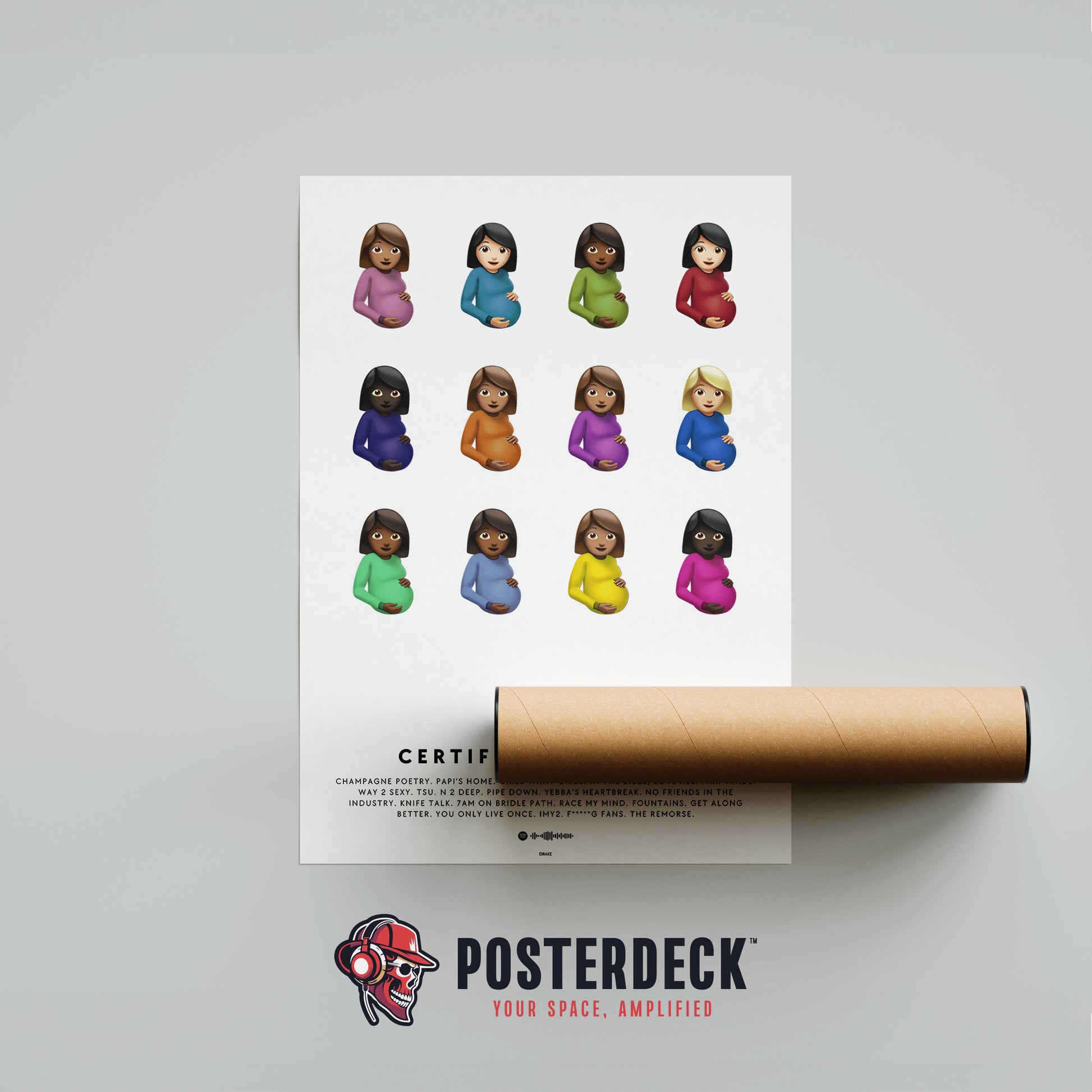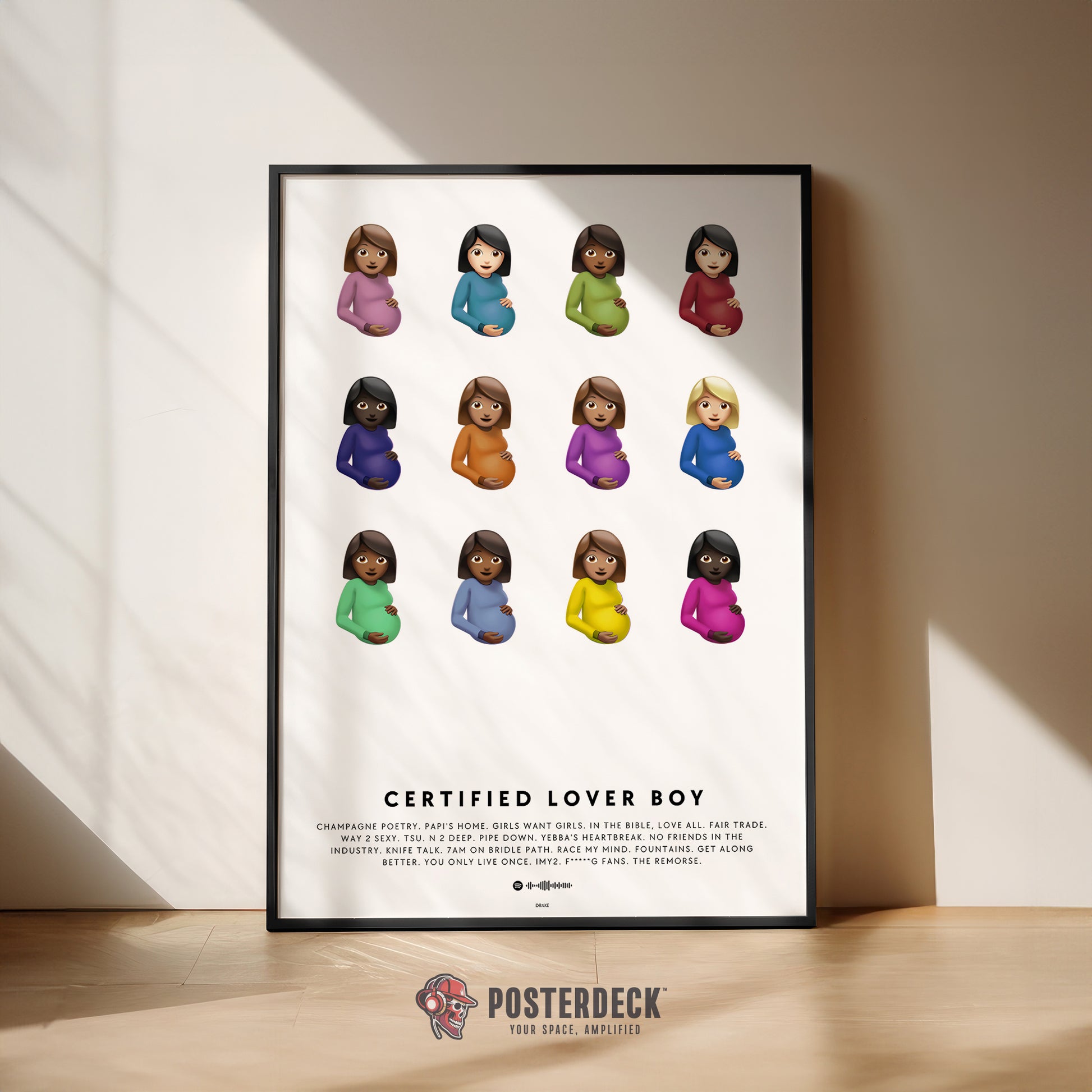 The iconic 2021 CLB artwork reimagined as a sleek, minimalist wall poster. Damien Hirst’s 12 pregnant emojis perfectly arranged above the full tracklist, crisp typography, and subtle OVO soundwave—clean, bold, and instantly recognizable.