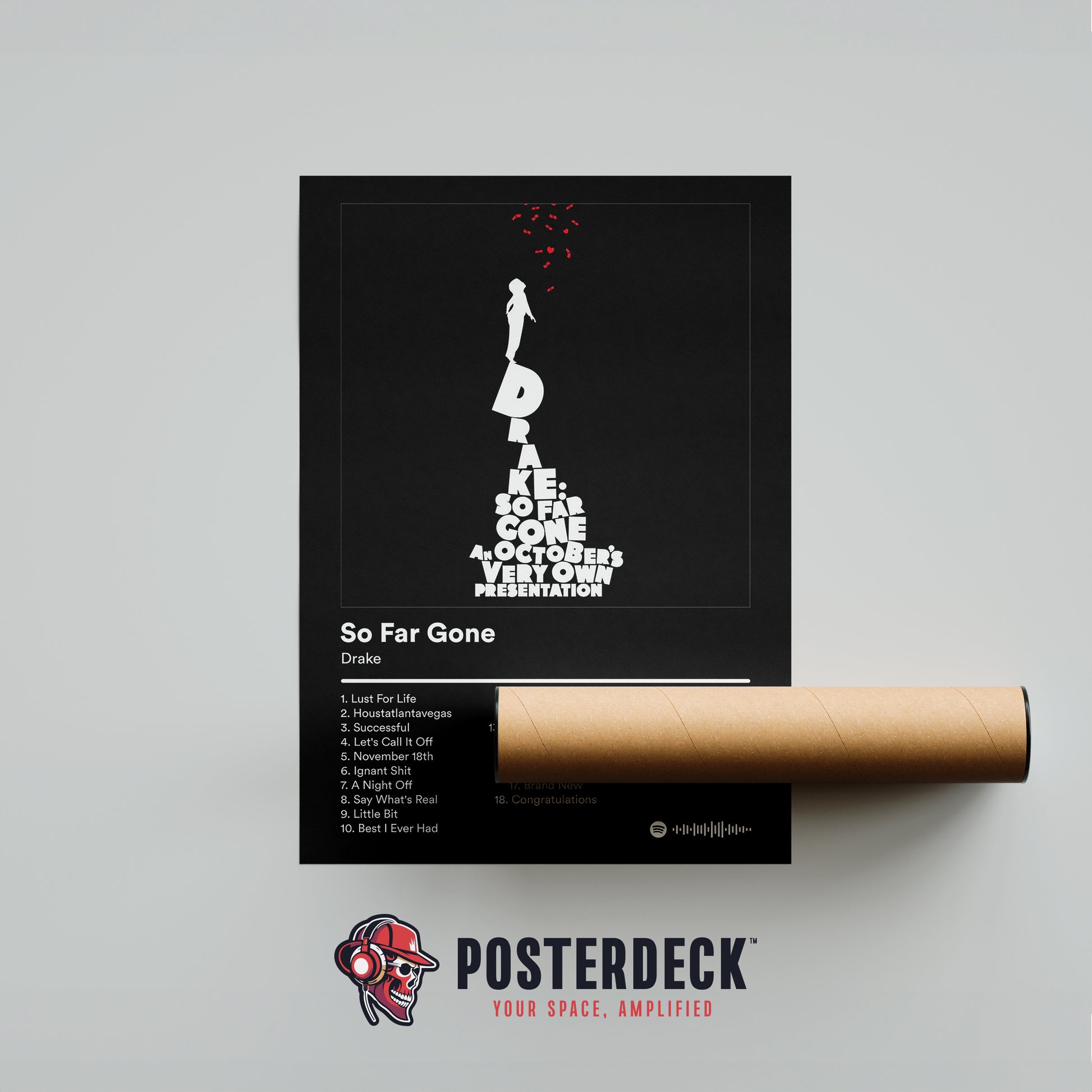 Celebrate one of the most influential mixtapes of all time with this bold, minimalist So Far Gone poster. Designed with striking typography and a dramatic black background, it pays homage to Drake’s breakthrough era and the project that helped reshape modern hip-hop and R&B.