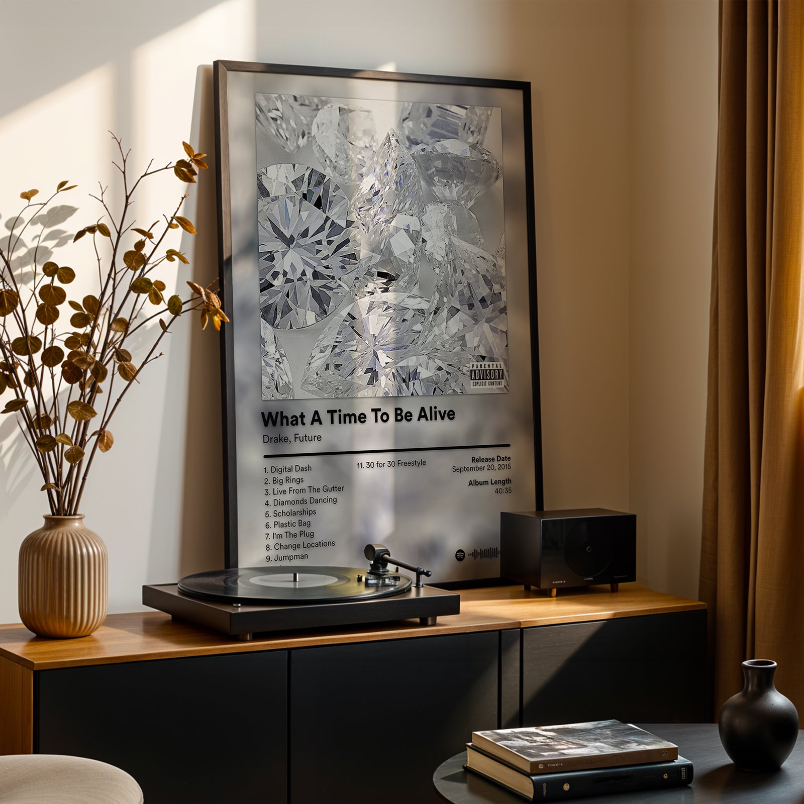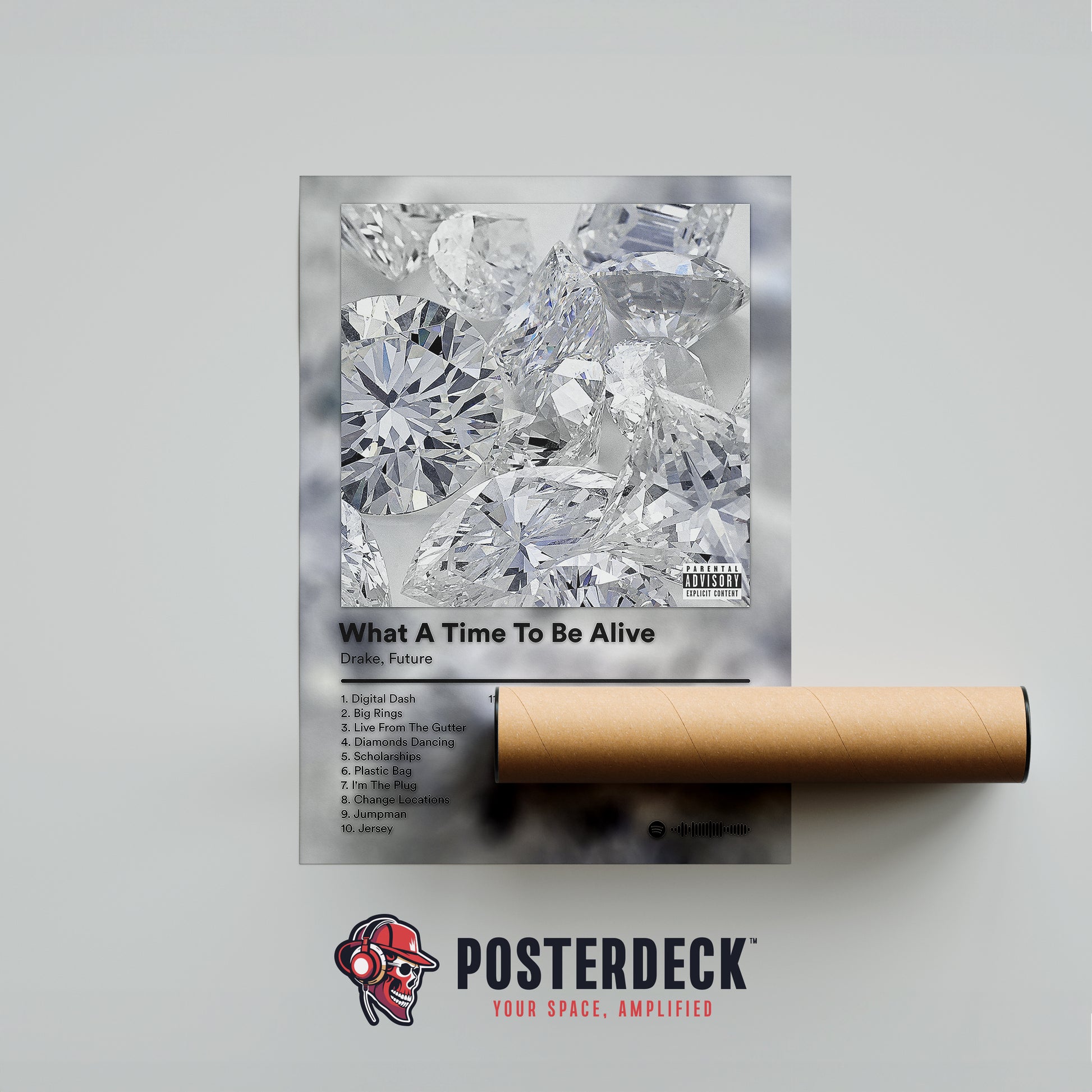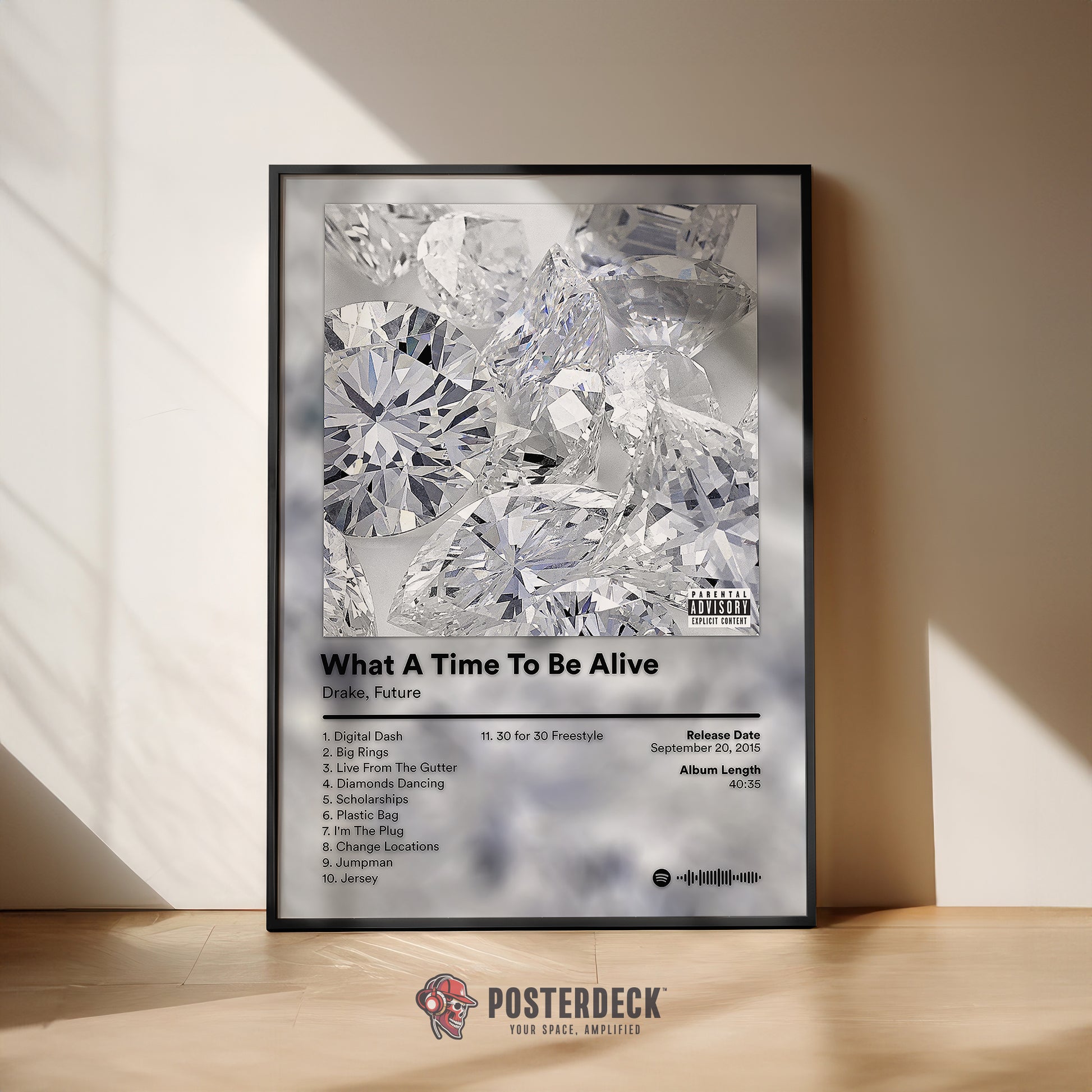 This What A Time To Be Alive poster captures the bold, luxury aesthetic of Drake and Future’s iconic collaborative project. Featuring the instantly recognisable diamond-covered artwork, this design reflects the confident, high-energy sound that defined the album. Clean typography, a crisp monochrome palette, and detailed tracklist information make it a standout piece for any hip-hop fan. Perfect for bedrooms, studios, or music spaces, this poster adds a sleek, modern edge while celebrating one of rap’s most influential joint releases.