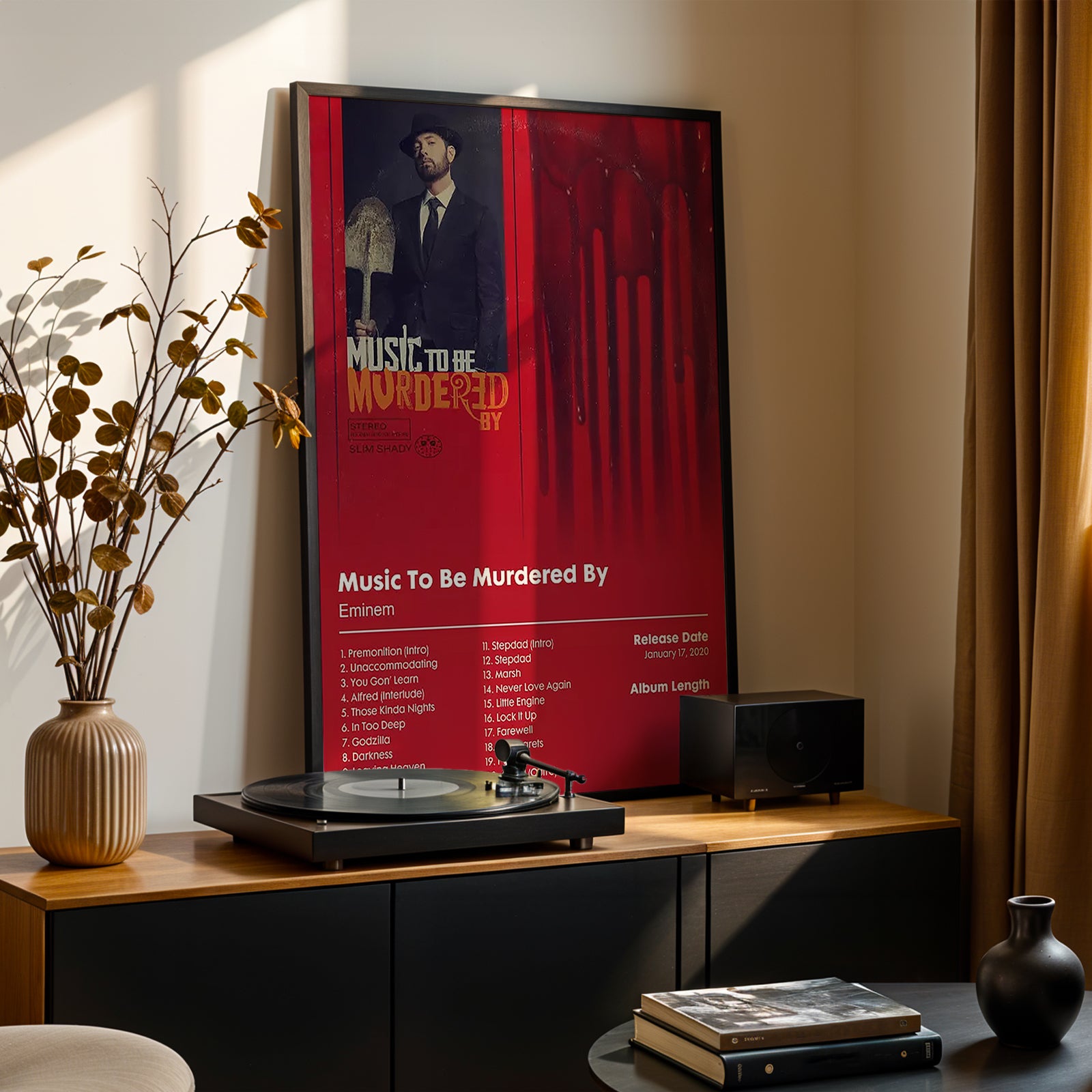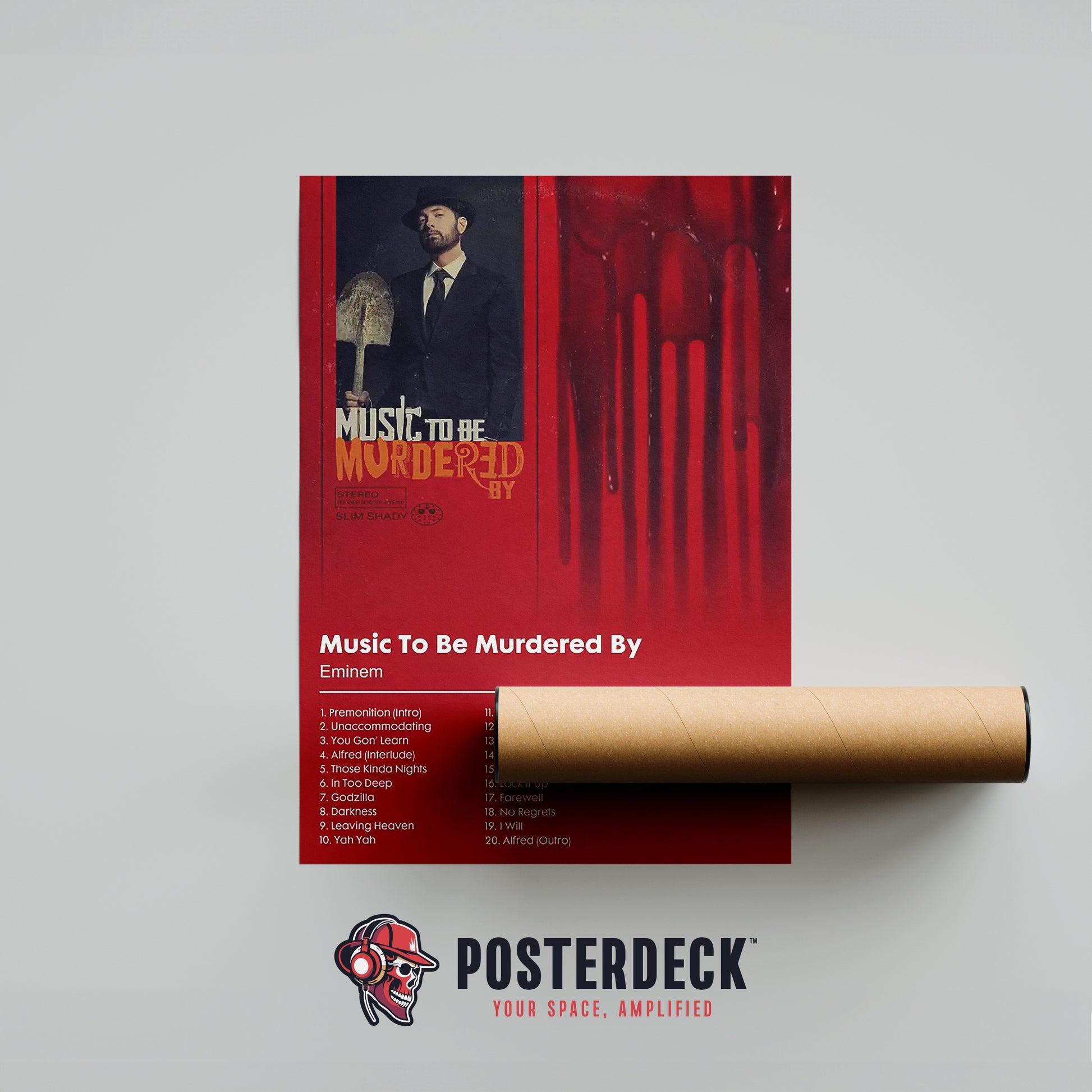 Bring the dark, cinematic mood of Music To Be Murdered By into your space with this dramatic poster featuring the album’s vintage-inspired noir artwork. The deep red palette and iconic Alfred Hitchcock homage perfectly echo the eerie, intense atmosphere of the project.