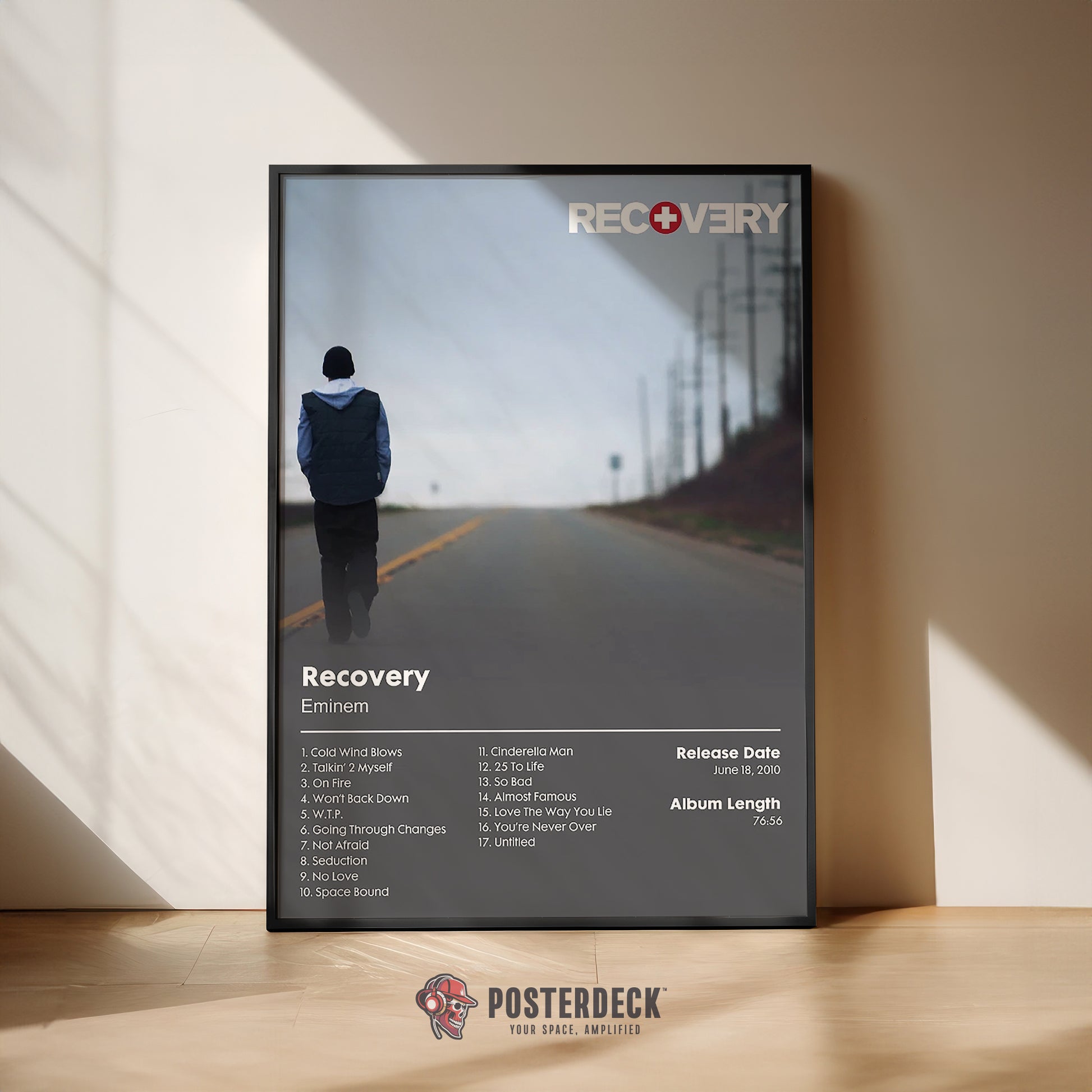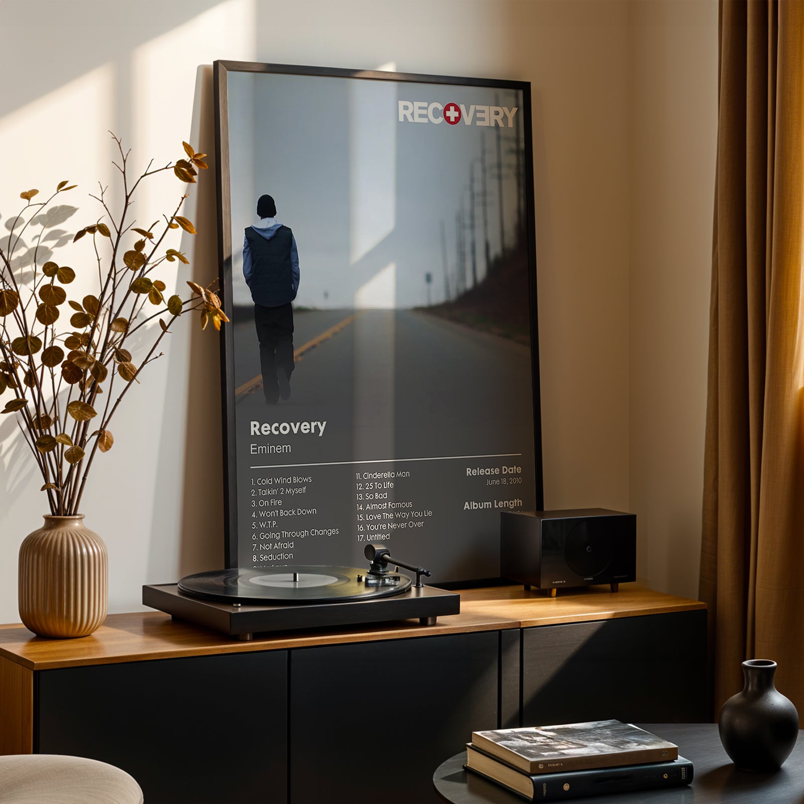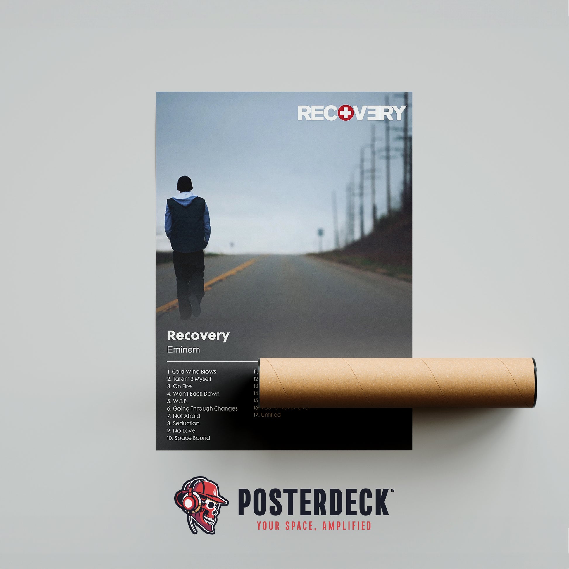 This Recovery poster captures the reflective, stripped-back mood of Eminem’s comeback era, featuring the lonely road imagery that symbolizes resilience and rebuilding. Its soft tones and minimal design mirror the introspective nature of the album’s themes.