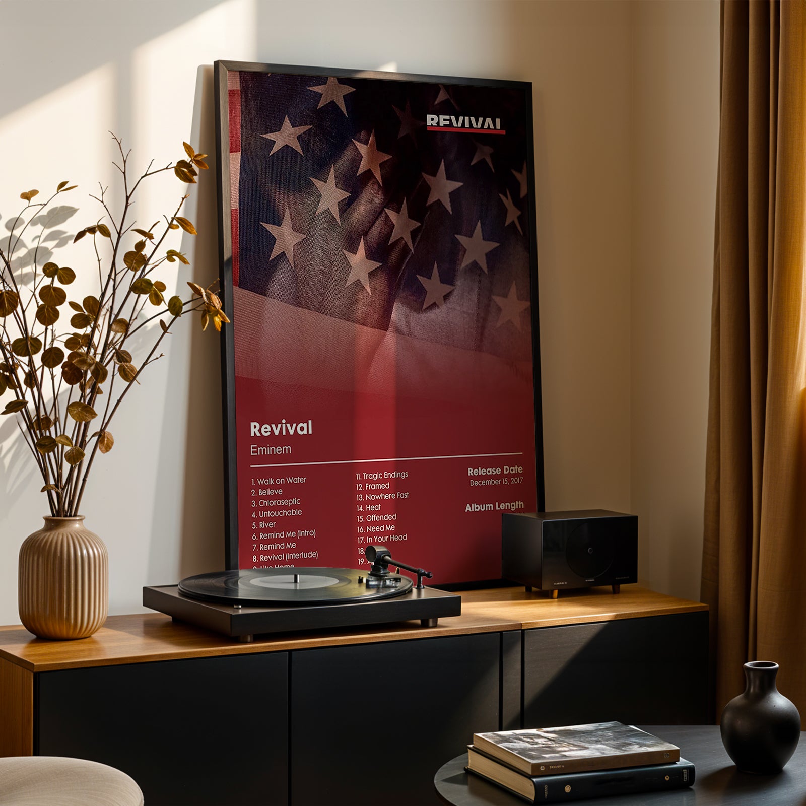 This Revival poster highlights the somber, politically charged American flag imagery that defined one of Eminem’s most emotional and polarizing albums. The deep red tones and textured design capture the weight and vulnerability of its themes.