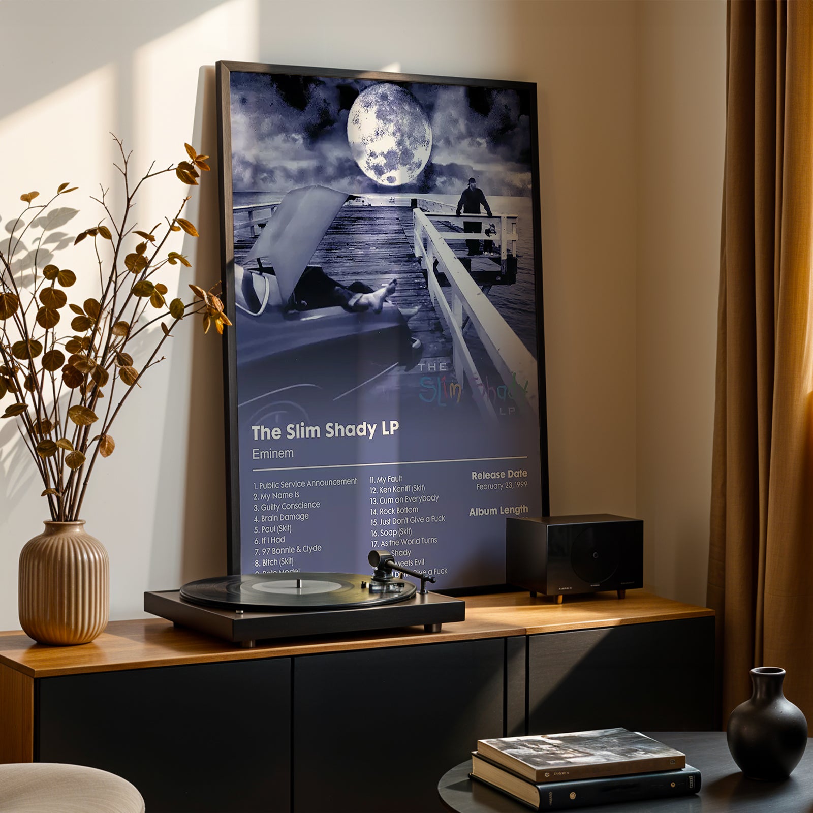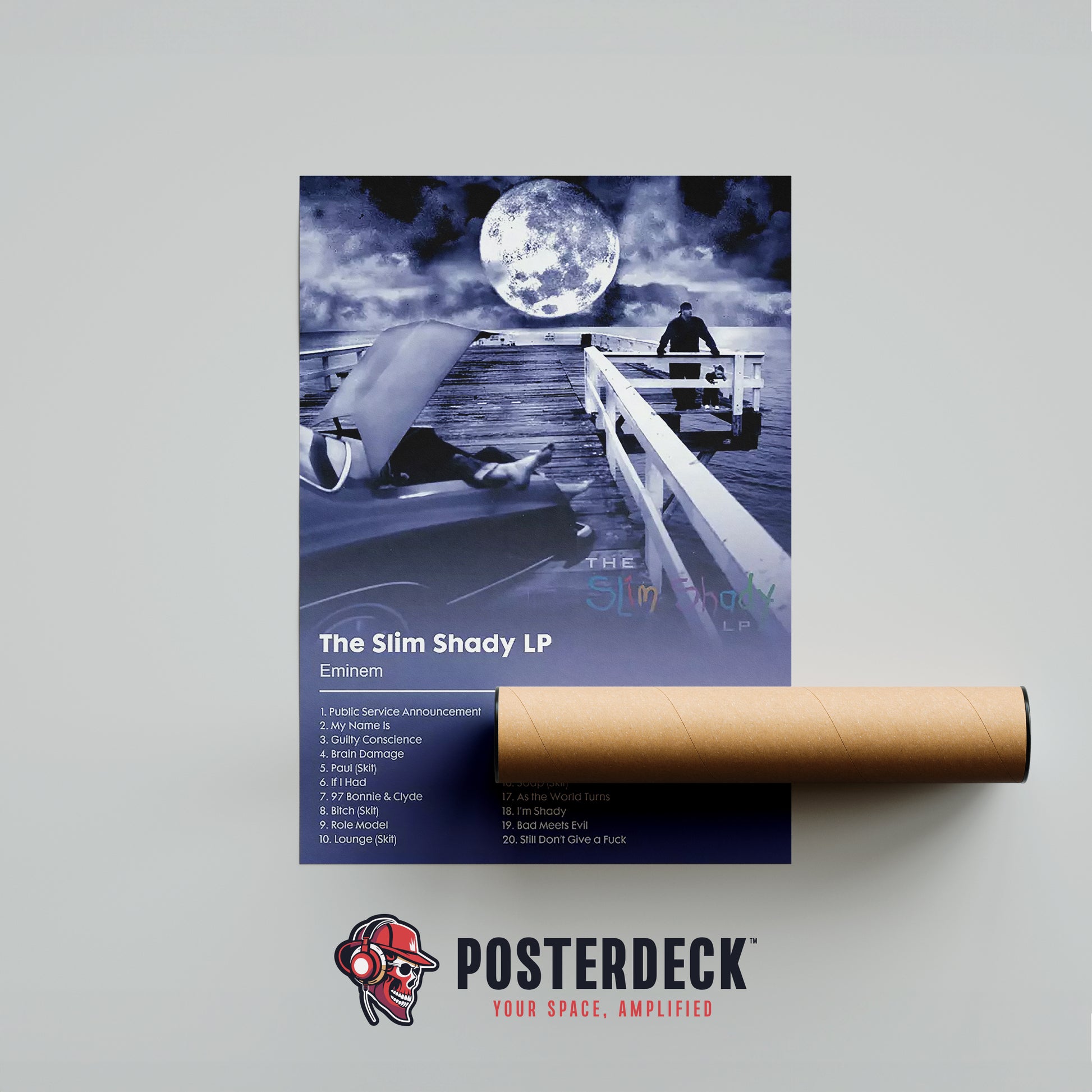 Bring the chaotic, surreal spirit of Eminem’s rise to fame into your space with this Slim Shady LP poster. Its eerie nighttime pier scene and bold, dreamlike colors perfectly mirror the wild imagination and unapologetic storytelling that launched the Slim Shady persona into the spotlight.