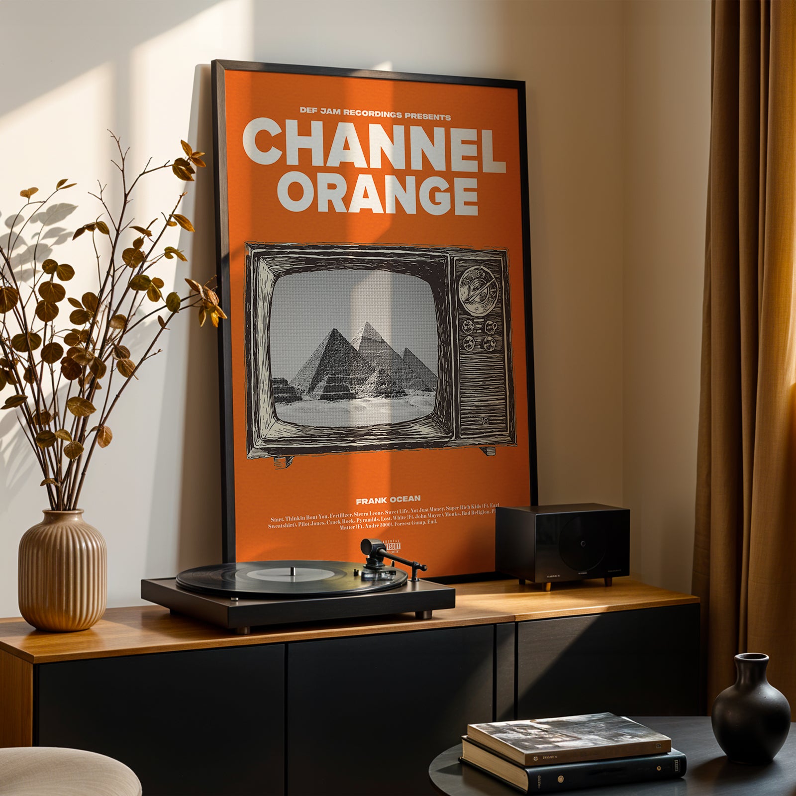 Showcasing the album’s signature orange aesthetic through a vintage TV illustration, this channel ORANGE poster radiates charm and creativity. Its bold color and retro-styled design echo the vibrant world of Frank Ocean’s breakout release.