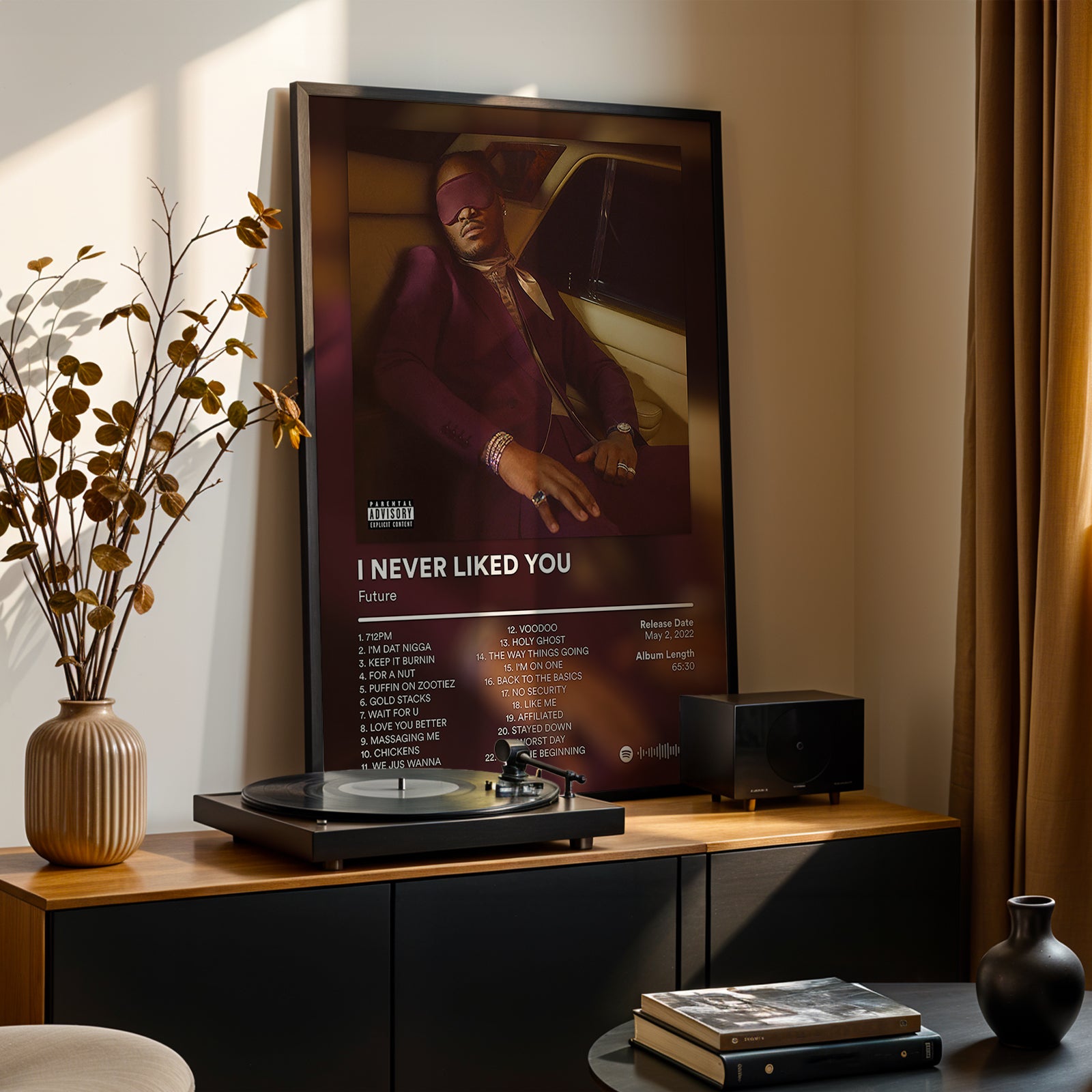 This I Never Liked You poster features a luxurious, cinematic look that reflects Future’s unapologetic confidence. Perfect for collectors who want a bold, modern poster with serious presence.