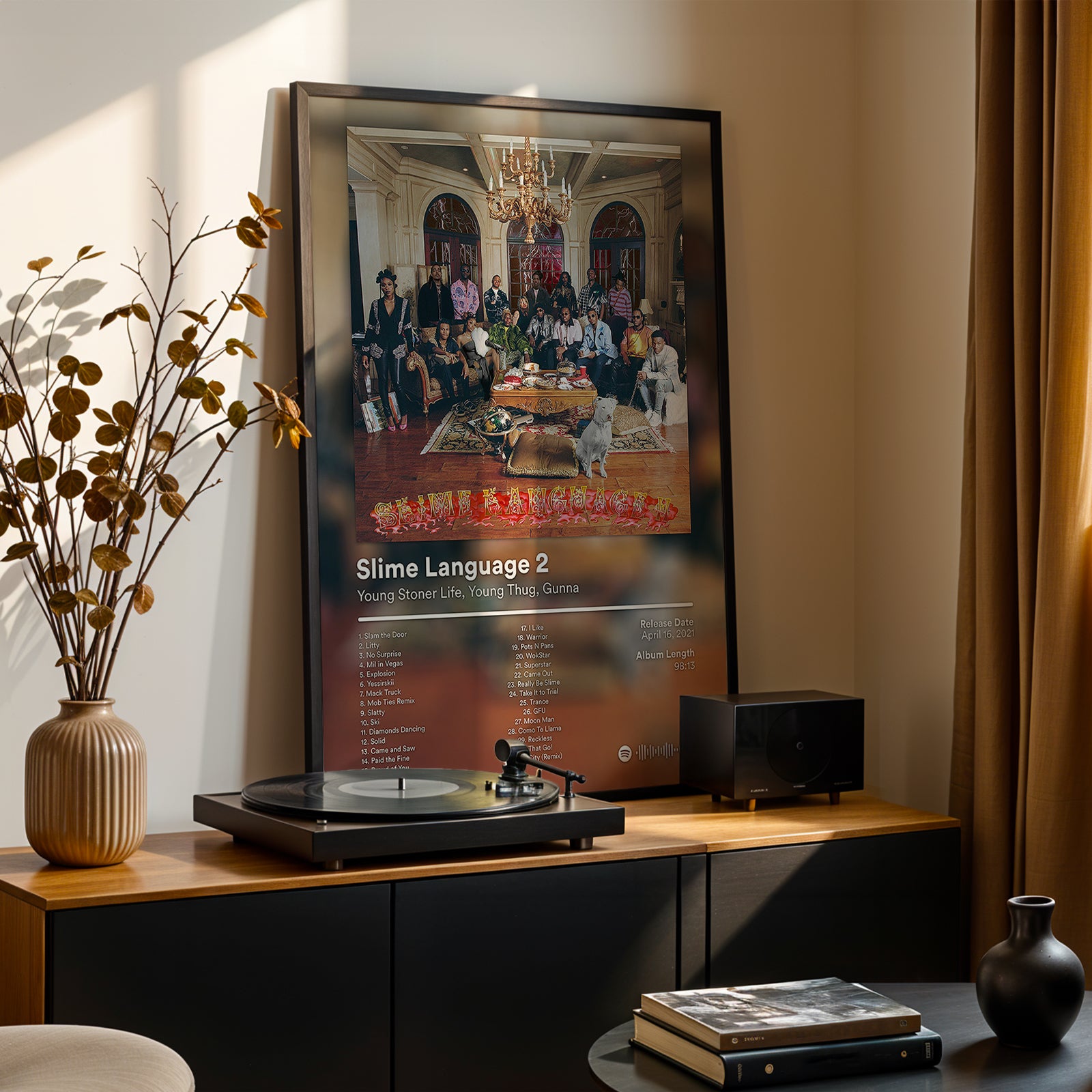 This poster highlights Slime Language 2, the foundation of the YSL collective sound. The bold group imagery celebrates creativity, loyalty, and movement-building. A strong choice for fans of modern trap history.