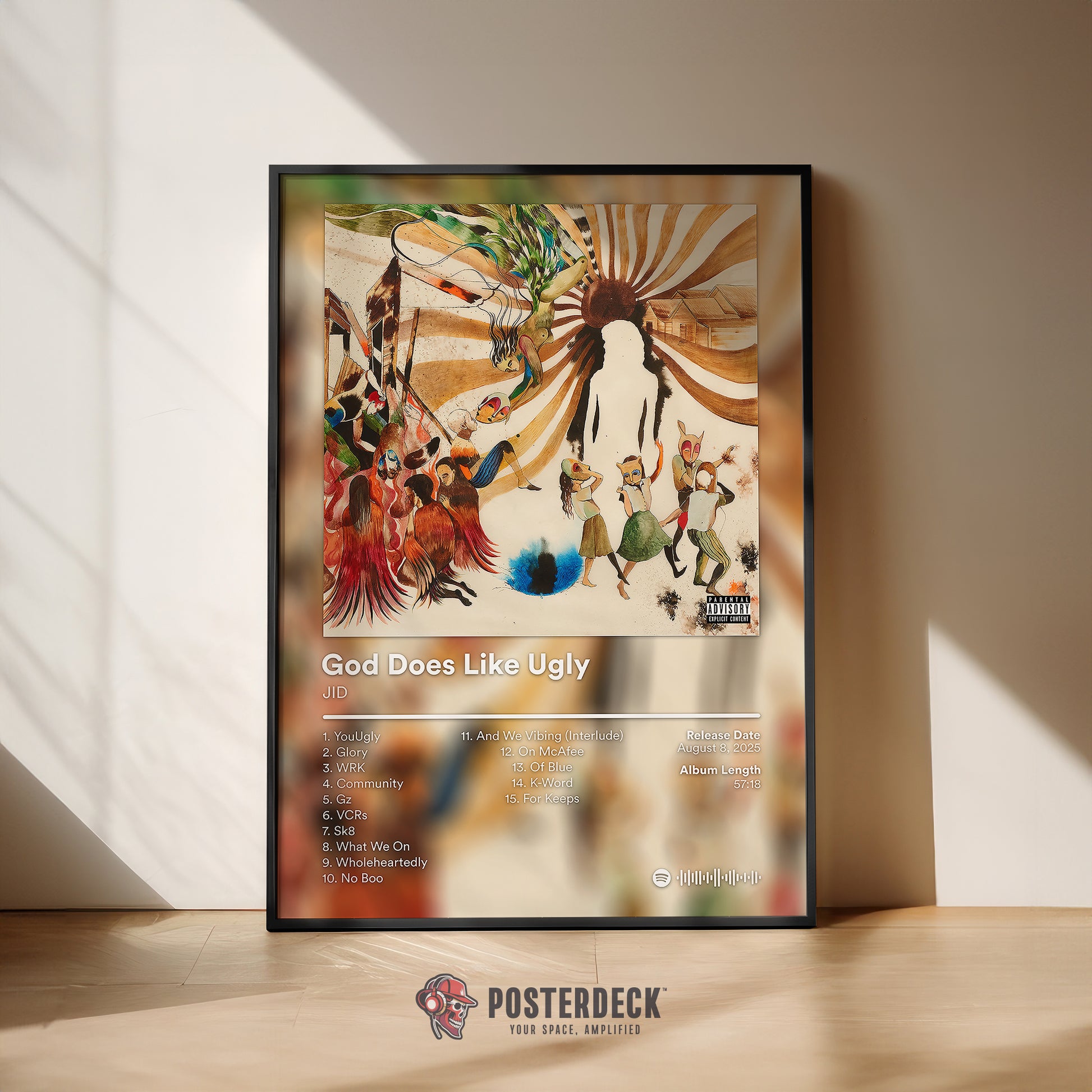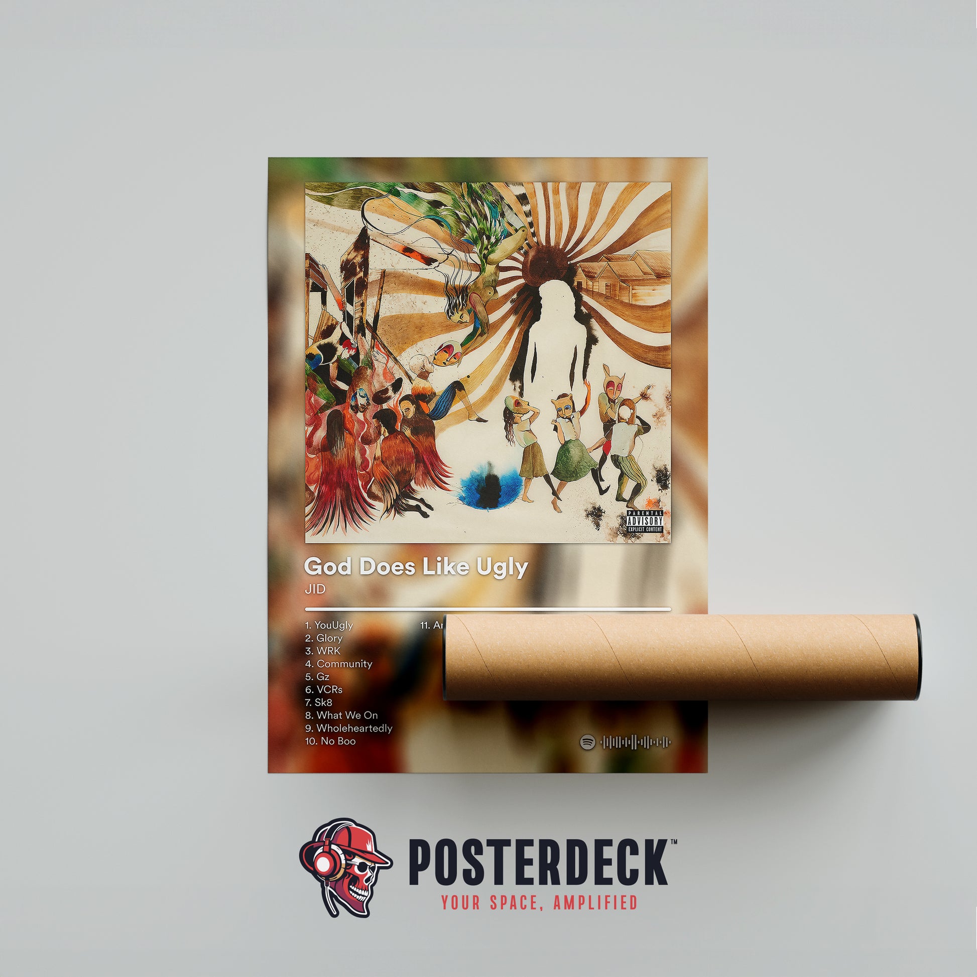 Highlighting one of JID’s most emotionally layered releases, this poster represents a reflective chapter in his artistry. God Does Like Ugly explores vulnerability, growth, and faith through JID’s signature precision and melodic experimentation. A meaningful addition for collectors who appreciate the craft behind modern lyricism.