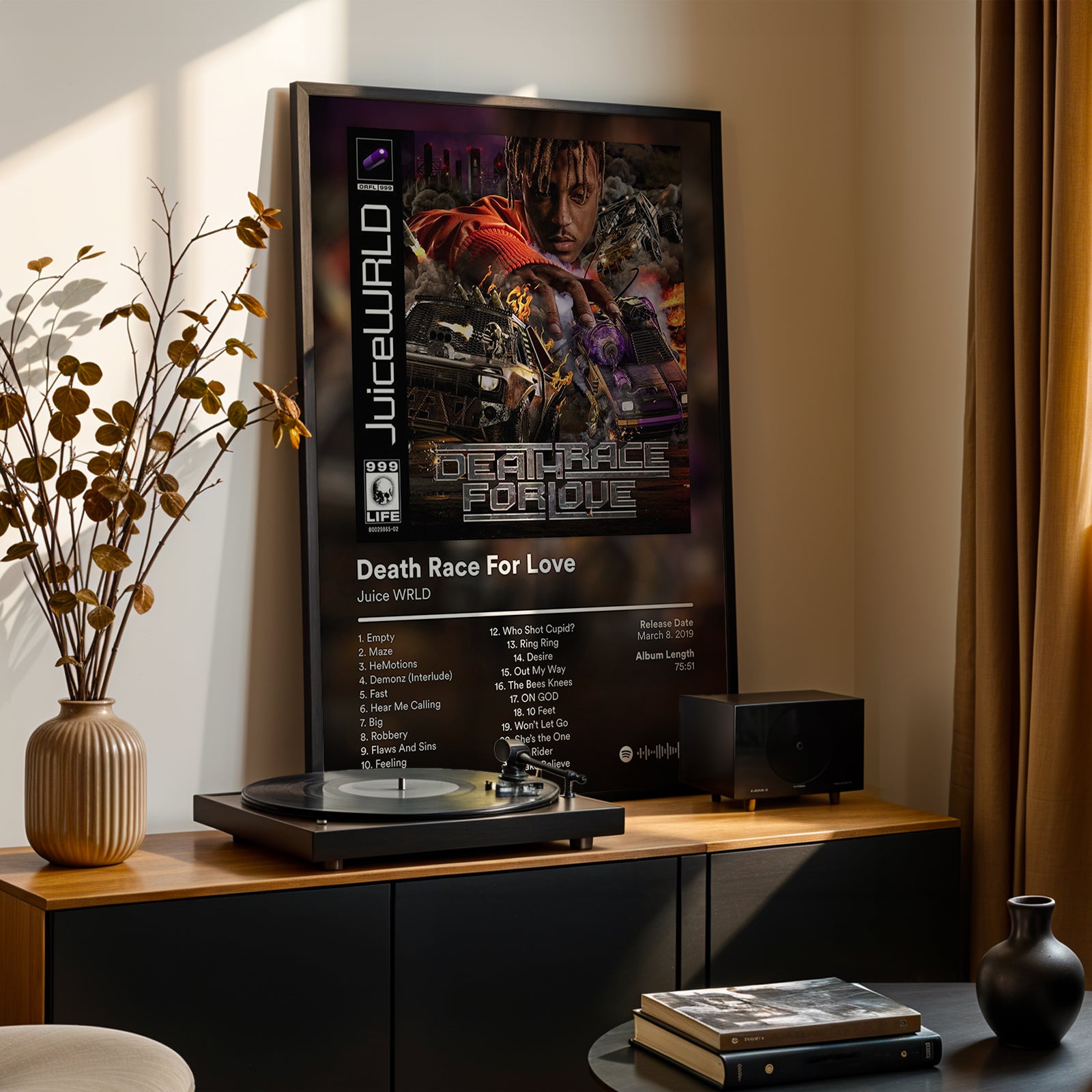 Death Race for Love expanded Juice WRLD’s sonic palette through high-energy production, freestyle-driven lyricism, and genre-crossing experimentation. The album showcased his ability to merge emotional transparency with exhilarating trap anthems. This artwork honors one of his most ambitious and influential projects.