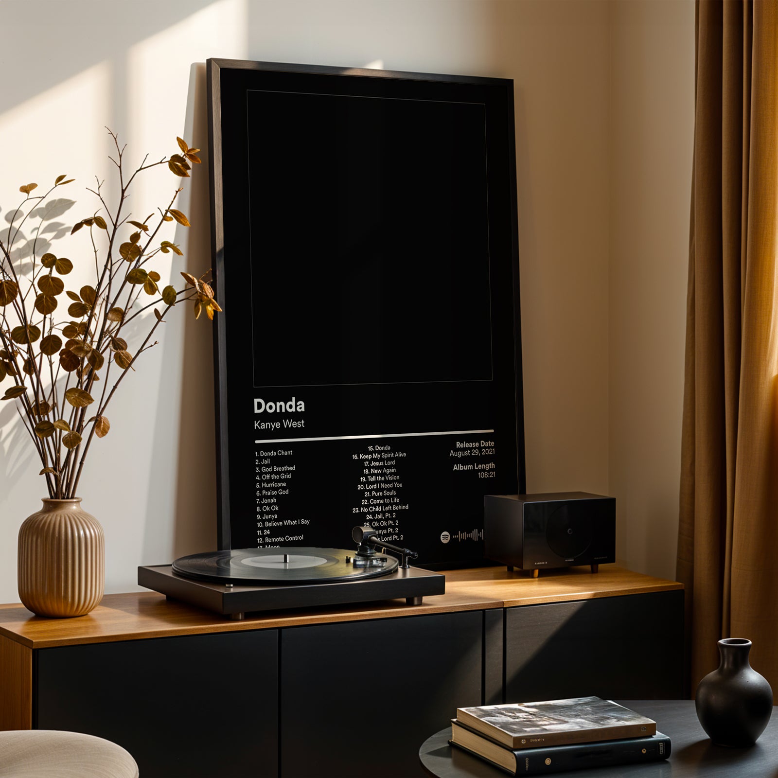 A sleek, minimalist representation of the Donda release, using a stark black cover for maximum dramatic contrast. Premium typography and a clean hierarchy give this print a museum-style presentation, making it a refined addition to any modern collection.