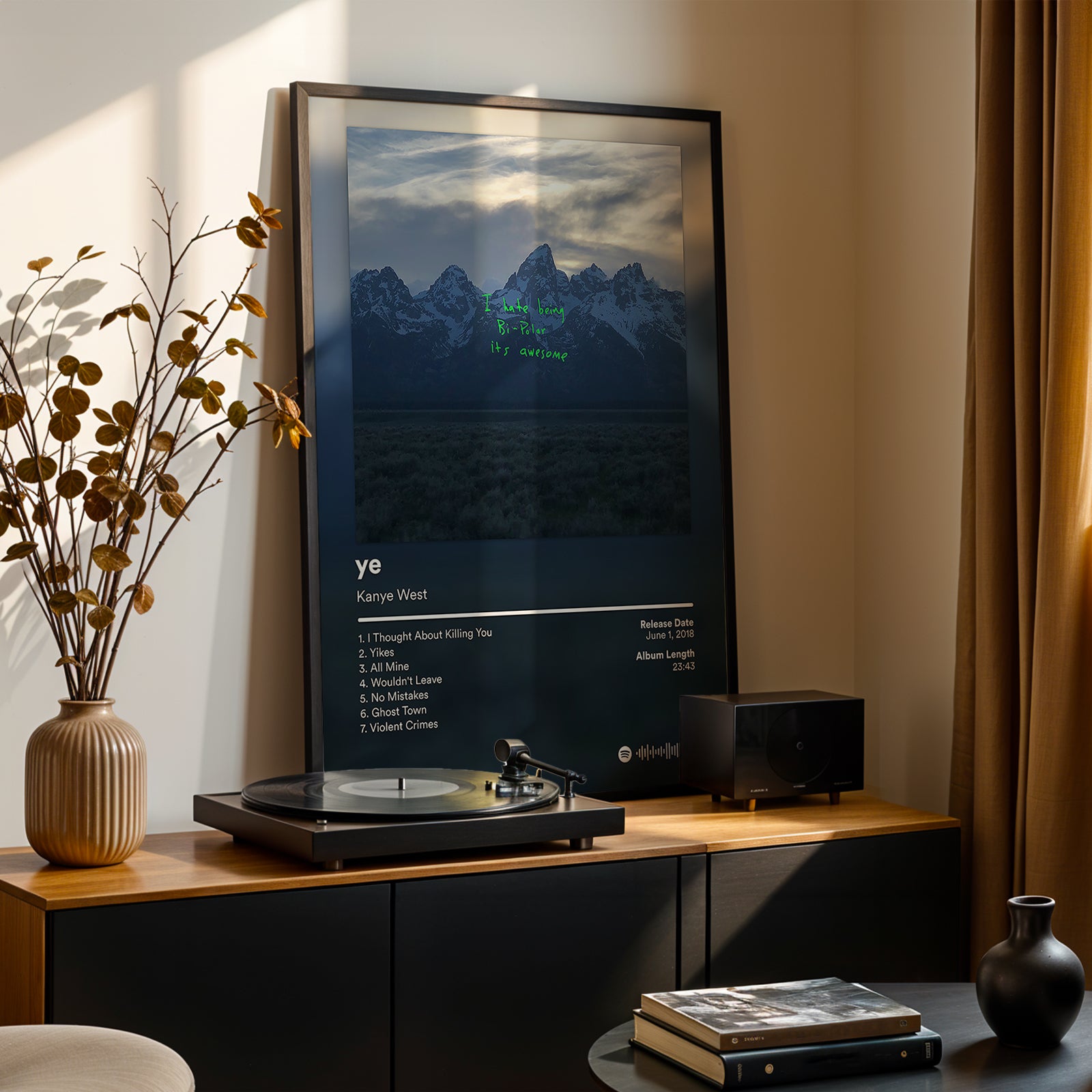 Minimal and introspective, this Ye poster showcases the serene Wyoming mountains with handwritten neon text. It perfectly captures the raw emotion and honesty of the album.