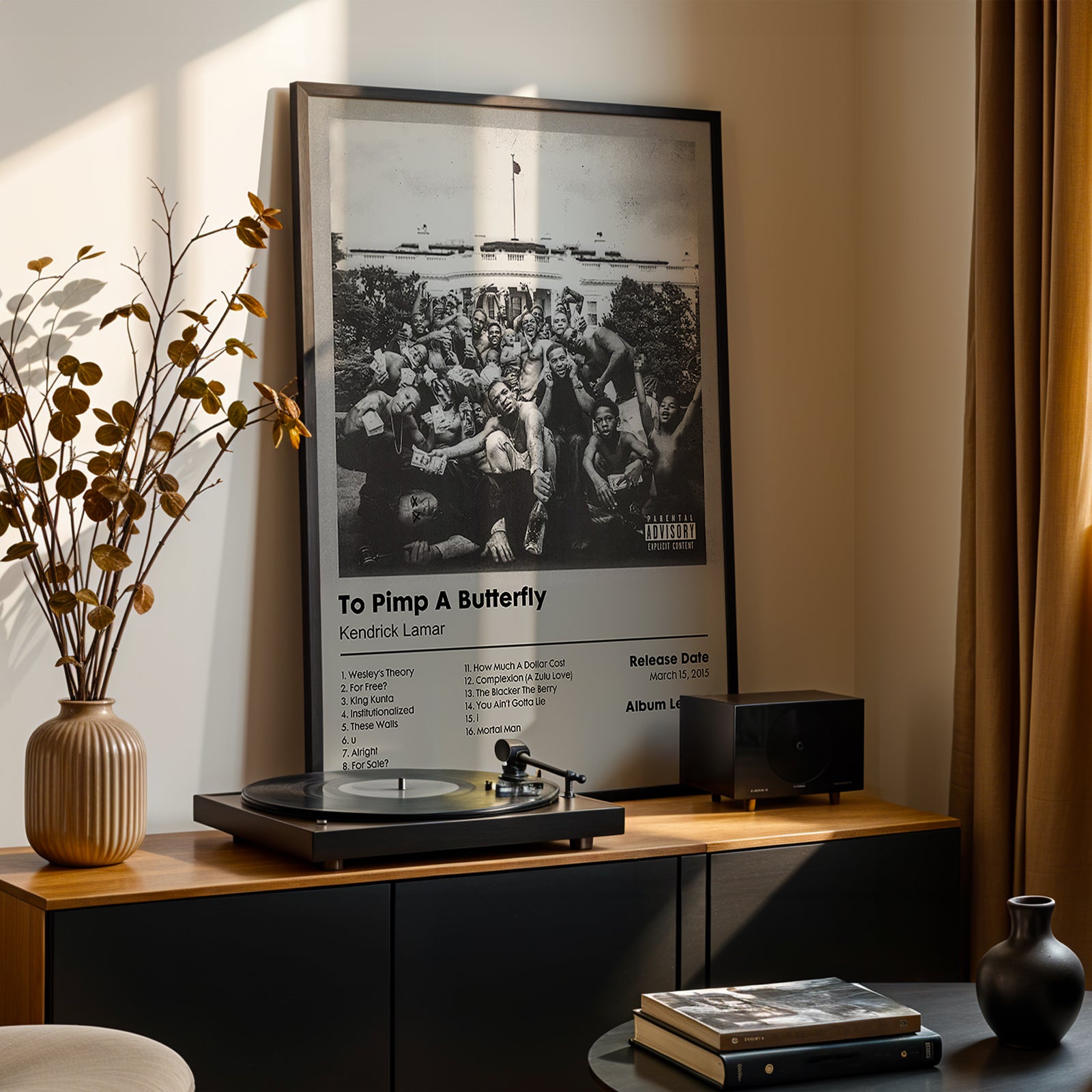 Showcasing the album’s unforgettable cover art, this To Pimp a Butterfly poster captures the revolutionary spirit of Kendrick’s most acclaimed body of work. Its bold imagery mirrors the album’s fearless themes of empowerment, identity, and transformation.