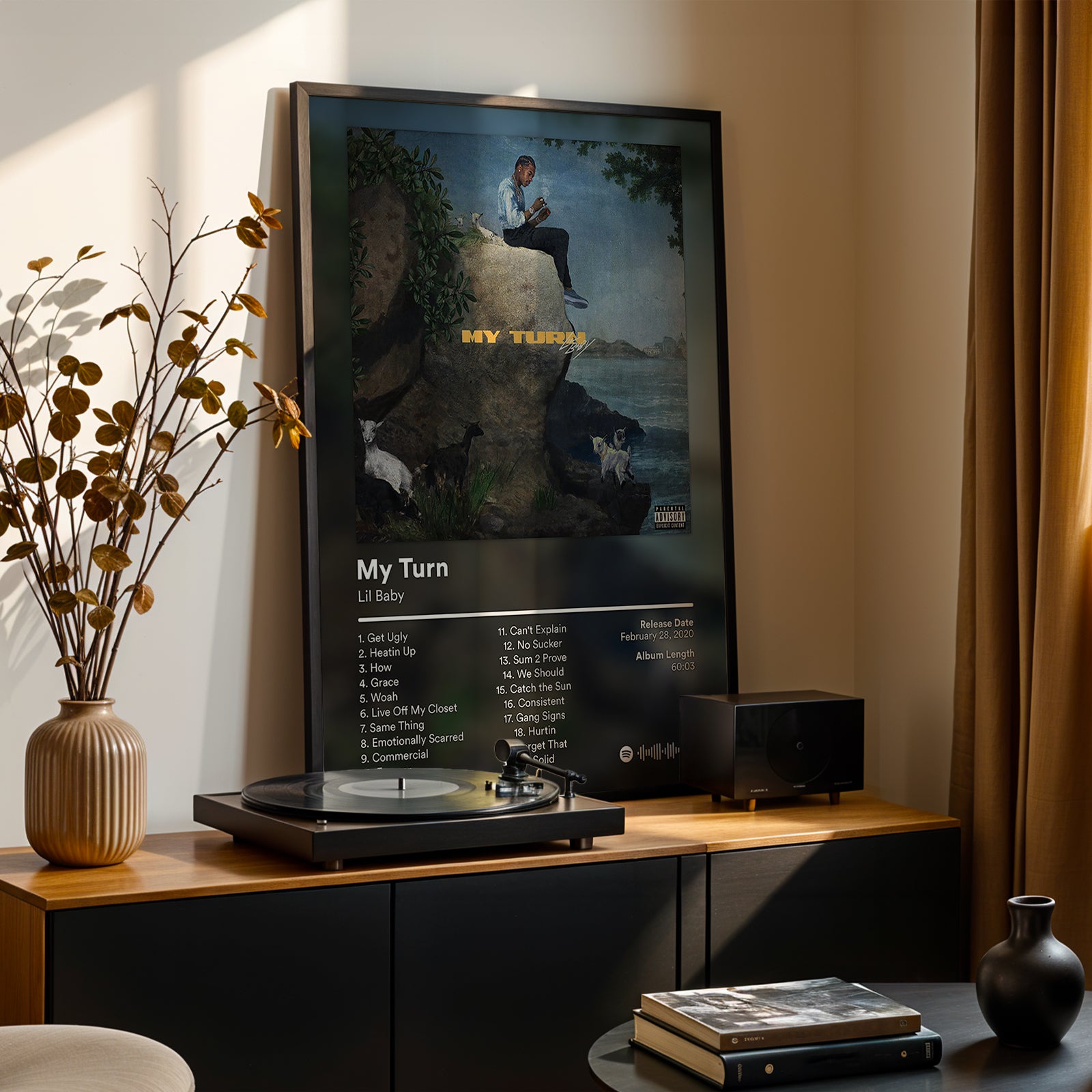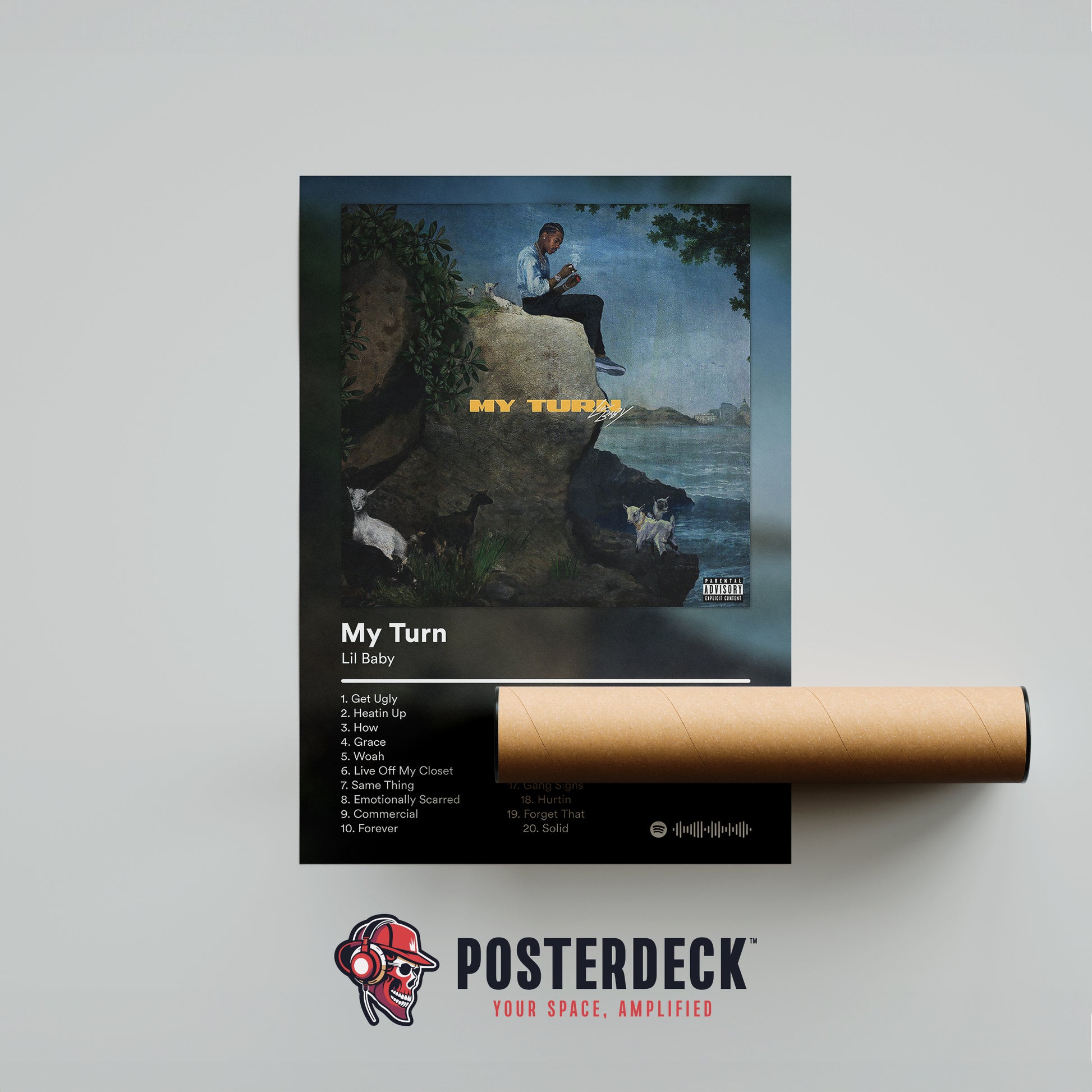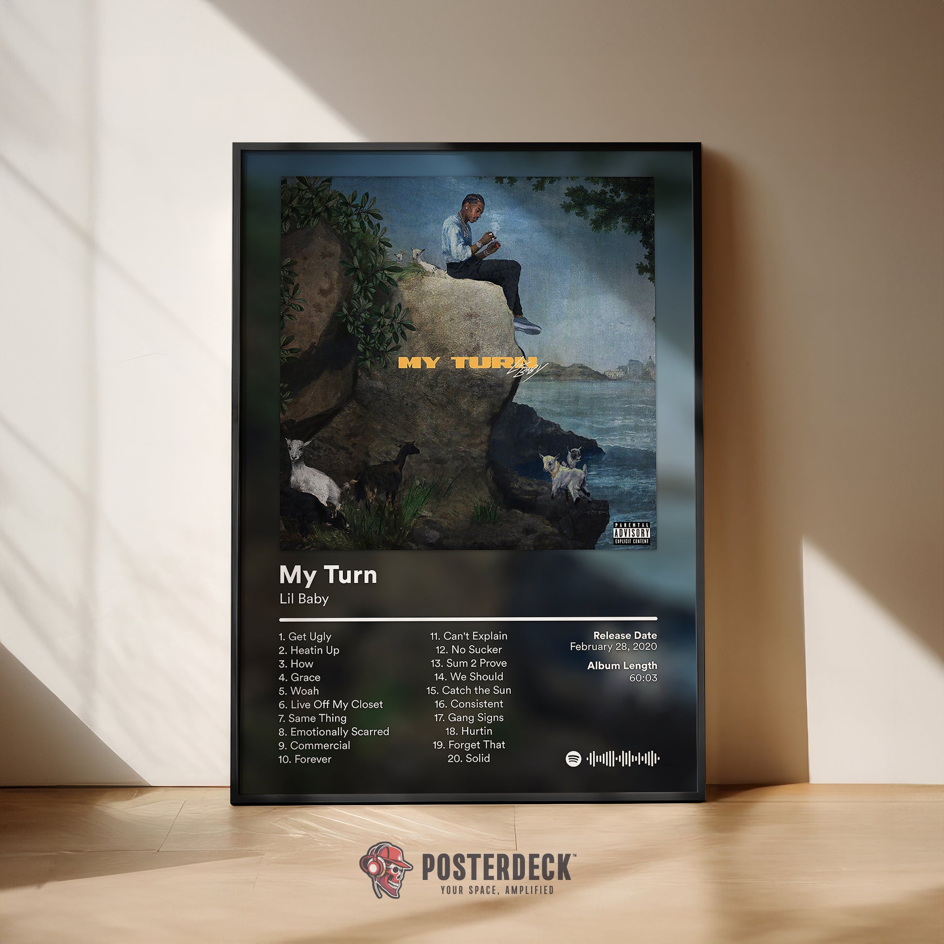 This poster features My Turn, the career-defining album that cemented Lil Baby as one of rap’s biggest names. Blending emotional depth with chart-dominating hits, it became a cultural moment and commercial powerhouse. An essential piece for any serious hip-hop collection.