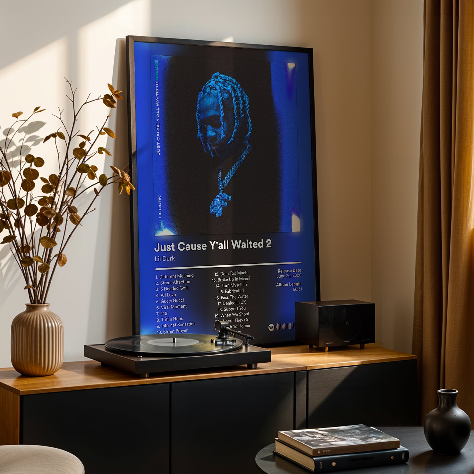 This poster displays Just Cause Y’all Waited 2, one of Lil Durk’s breakout albums that pushed him into mainstream recognition. Packed with street anthems and melodic flows, it defined a key moment in his rise. A must-have poster for longtime Durk supporters.