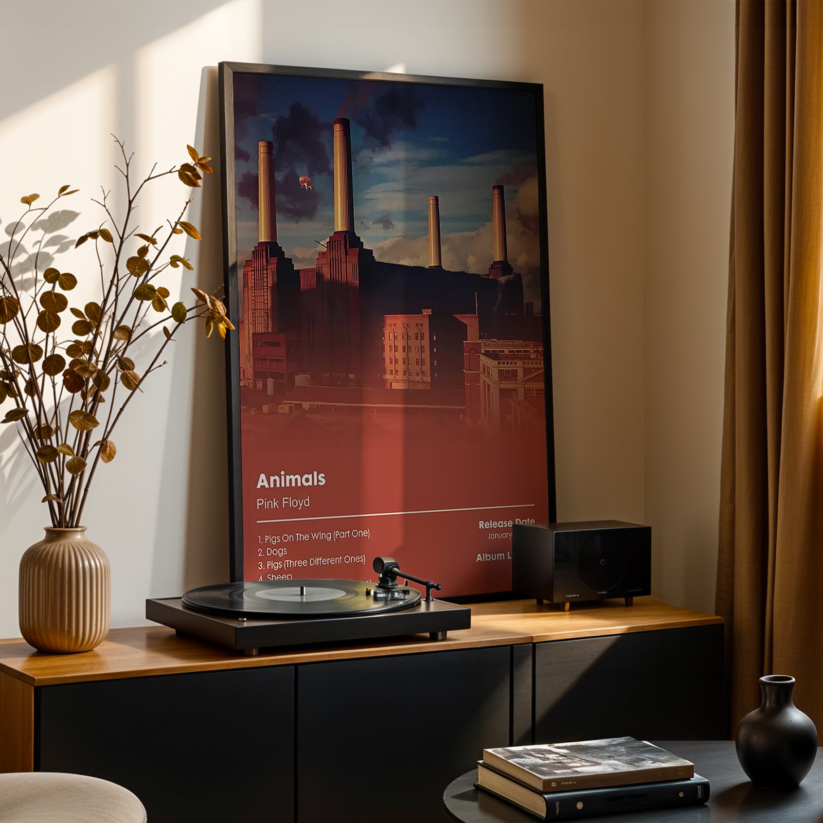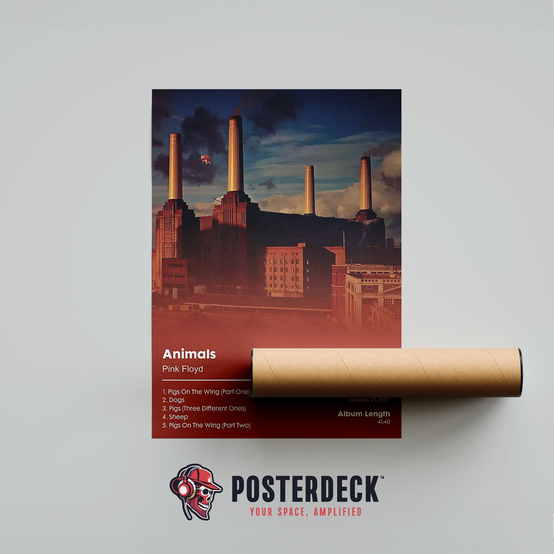 This Animals poster captures the album’s gritty industrial mood, spotlighting the iconic Battersea Power Station under a dramatic sky. A bold visual piece that reflects the record’s sharp social commentary and atmospheric sound.