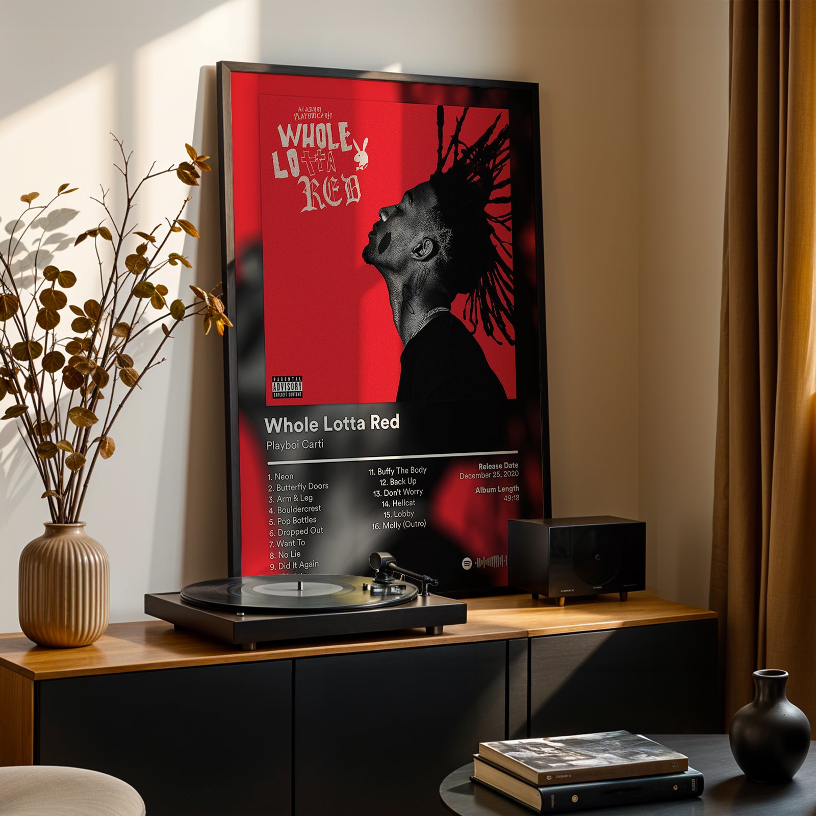 A vibrant red and black poster capturing the raw punk energy of Whole Lotta Red. Featuring Carti’s iconic profile imagery and complete album tracklist, this piece brings the intensity of the album’s aesthetic straight to your wall. A must-have for fans who want bold, expressive decor.