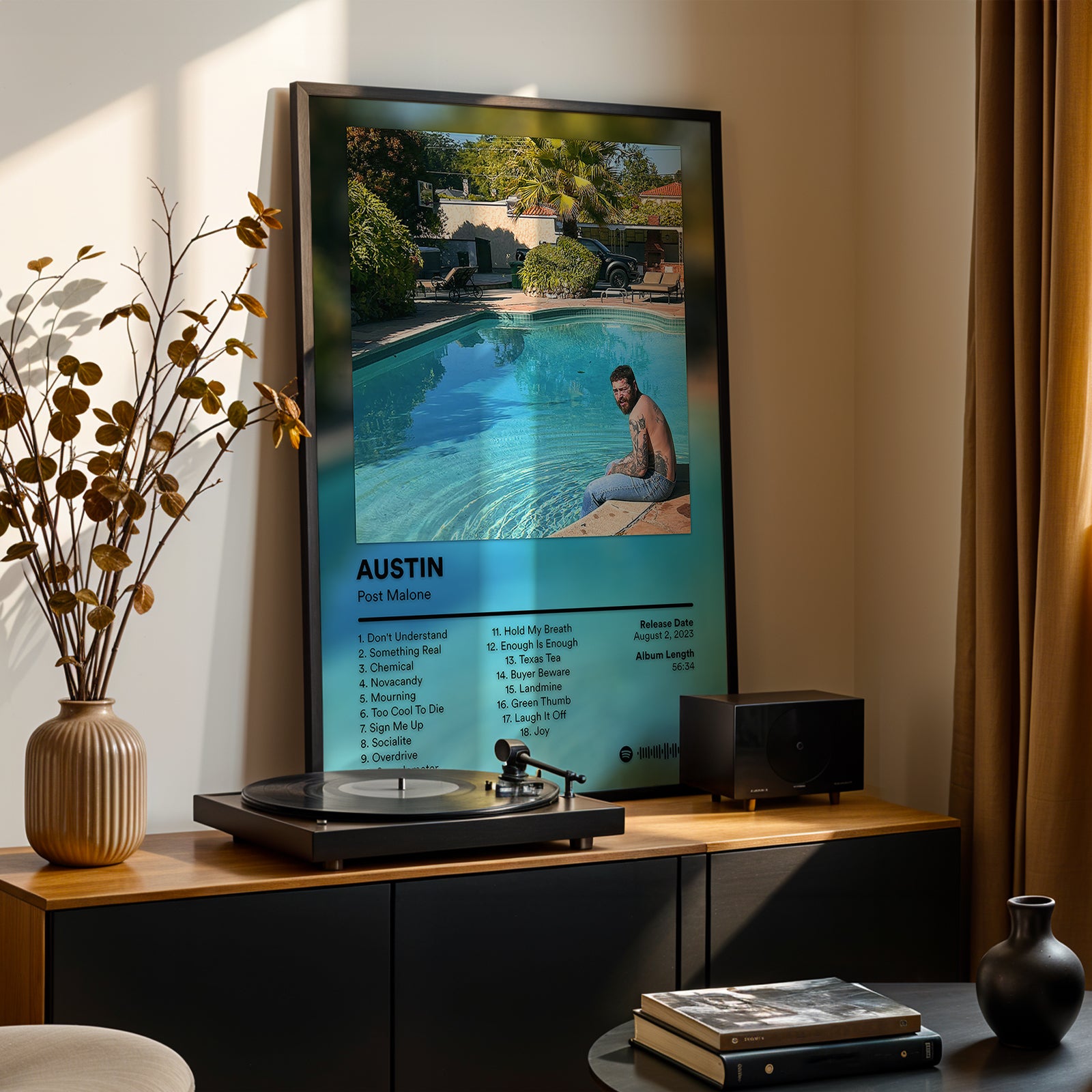 This Austin poster captures a laid-back, introspective aesthetic that reflects Post Malone’s most personal era. With calm tones and relaxed imagery, this poster is perfect for bedrooms, studios, or modern spaces that lean into mellow, reflective vibes.