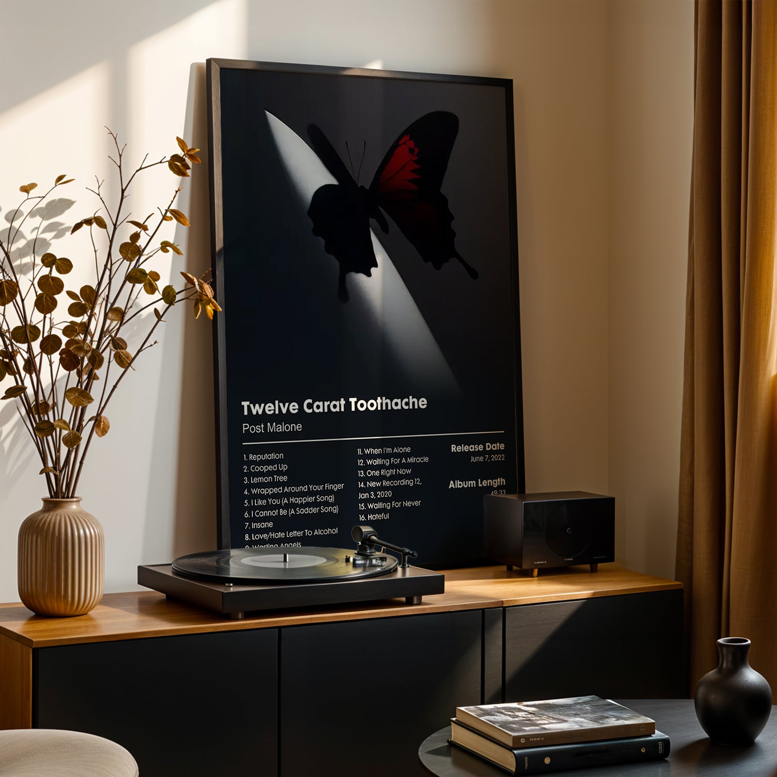 This Twelve Carat Toothache poster captures the album’s moody, atmospheric world. The dramatic butterfly imagery mirrors the project’s themes of change, tension, and emotional weight.