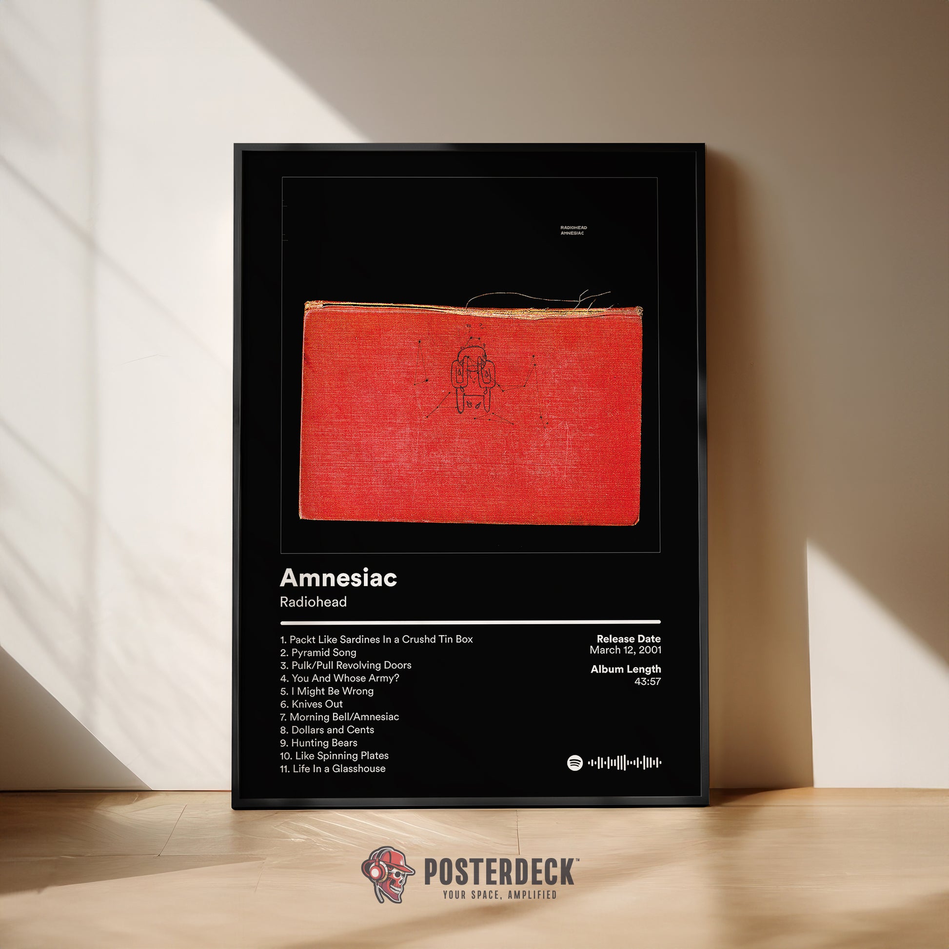 A striking minimalist design inspired by Radiohead’s Amnesiac era, featuring the iconic red book artwork against a deep black background. This piece captures the album’s haunting, fragmented atmosphere and experimental edge, making it a bold statement for fans of abstract rock visuals and modern music history.