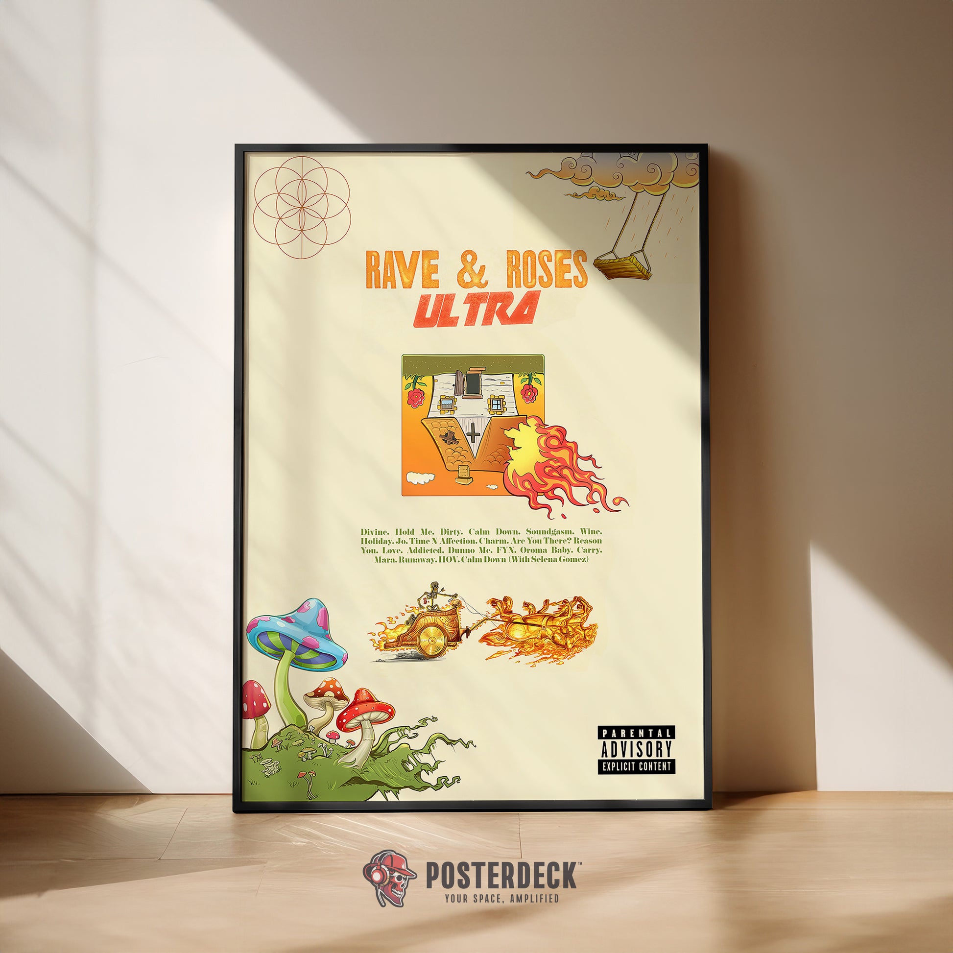 This Rave & Roses Ultra poster bursts with color and personality, mirroring the album’s energetic fusion of Afrobeats, pop, and vibrant storytelling. Its playful visuals reflect the project’s bold, lively spirit.