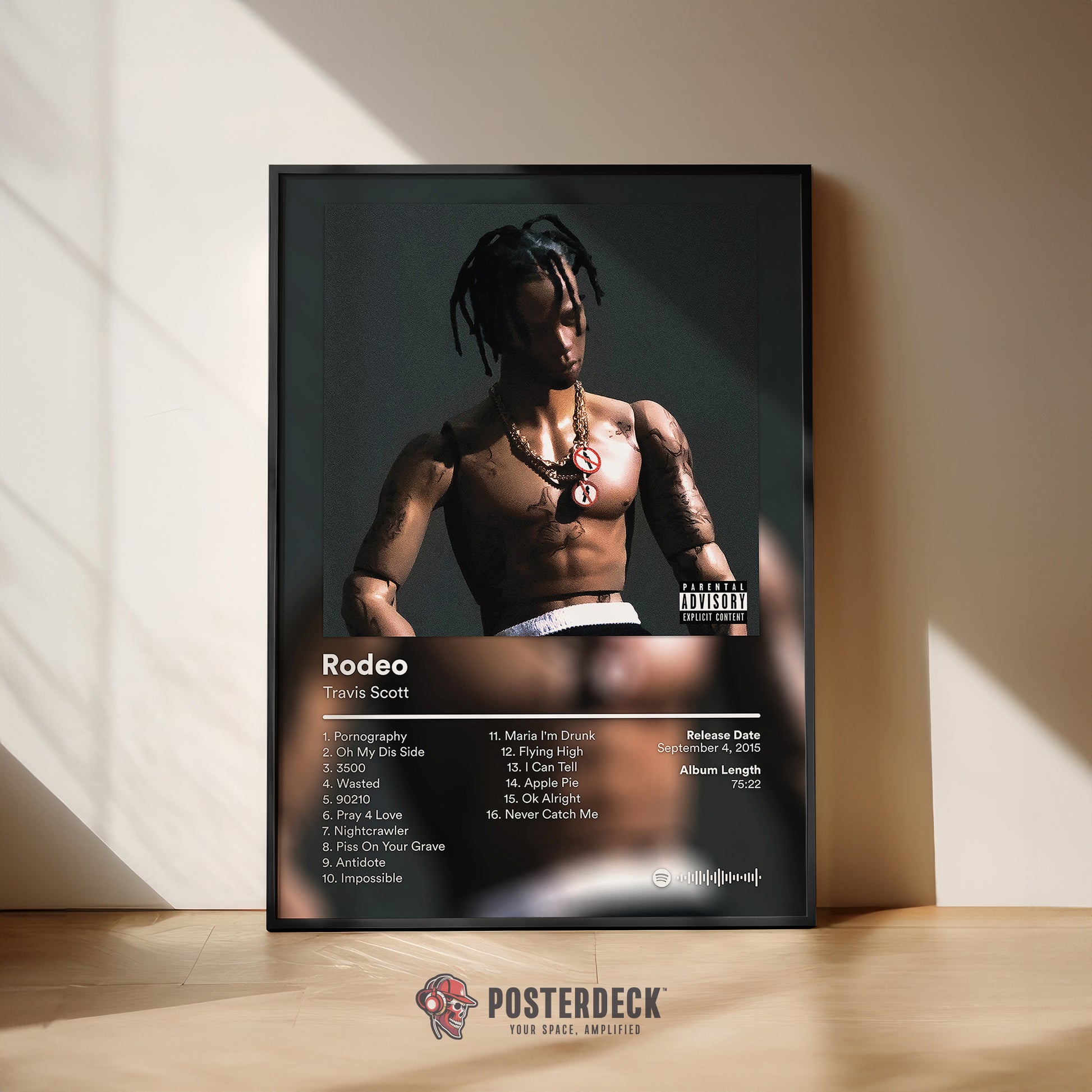 This Rodeo poster brings out the album’s brooding, futuristic style, with its shadowy lighting and striking pose. It reflects the genre-blending creativity that cemented Rodeo as a fan favourite.