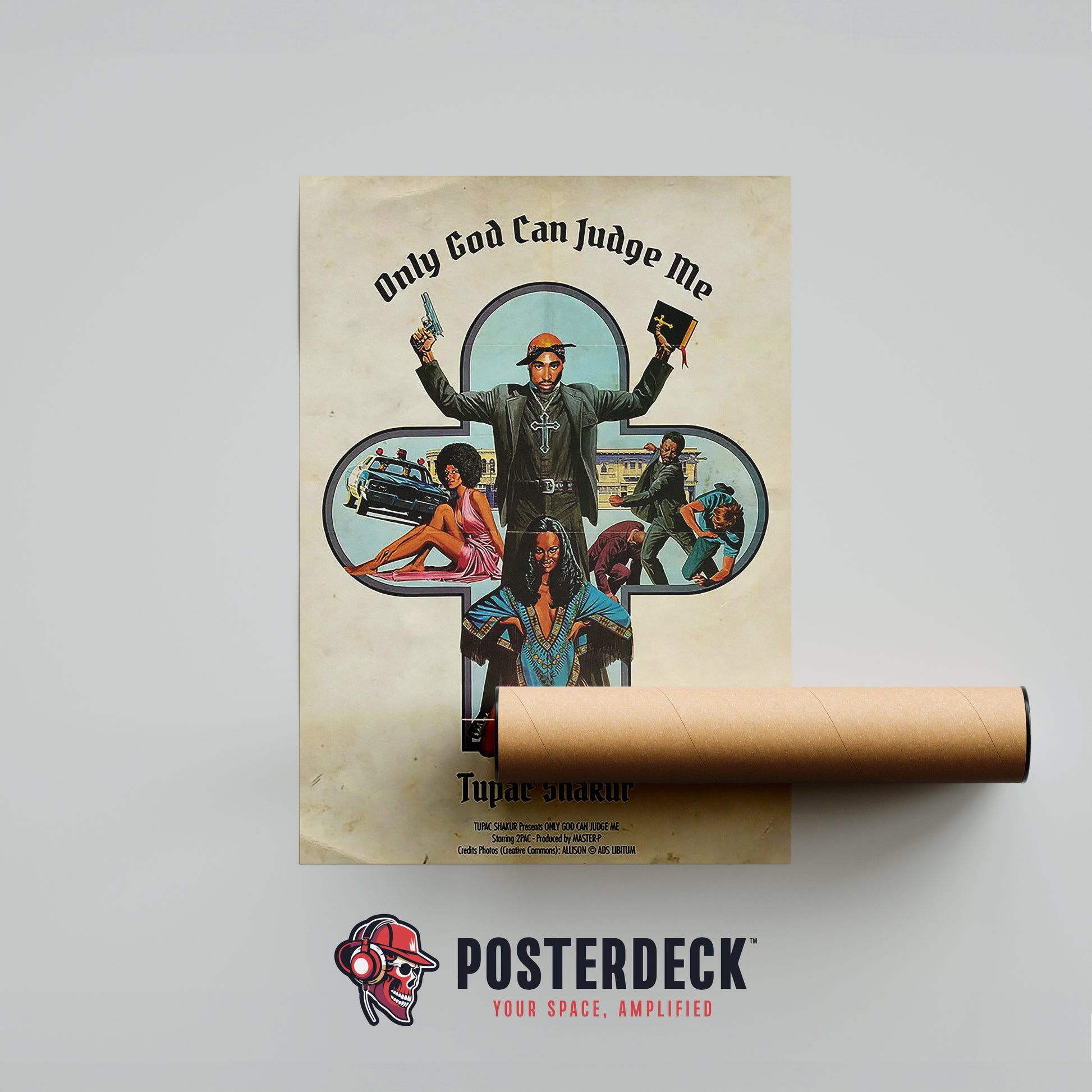 Channel the raw power of 2Pac's unapologetic legacy with this stunning "Only God Can Judge Me" poster, styled as a classic 70s blaxploitation film one-sheet. Tupac stands crucified on a bold cross, pistol in one hand, Bible in the other—symbolizing the ultimate duality of street life and spiritual redemption.