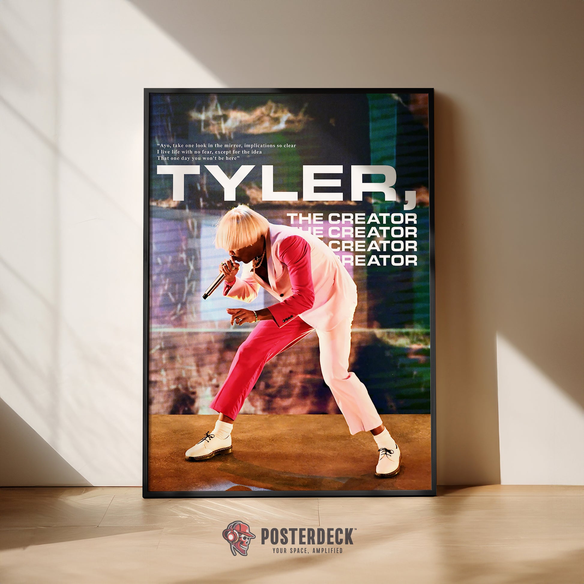 This Tyler, The Creator poster captures his energetic stage presence in his signature split pink-and-white suit. Dynamic, stylish, and full of personality, it’s an excellent tribute to his live performance aesthetic and artistic charisma.